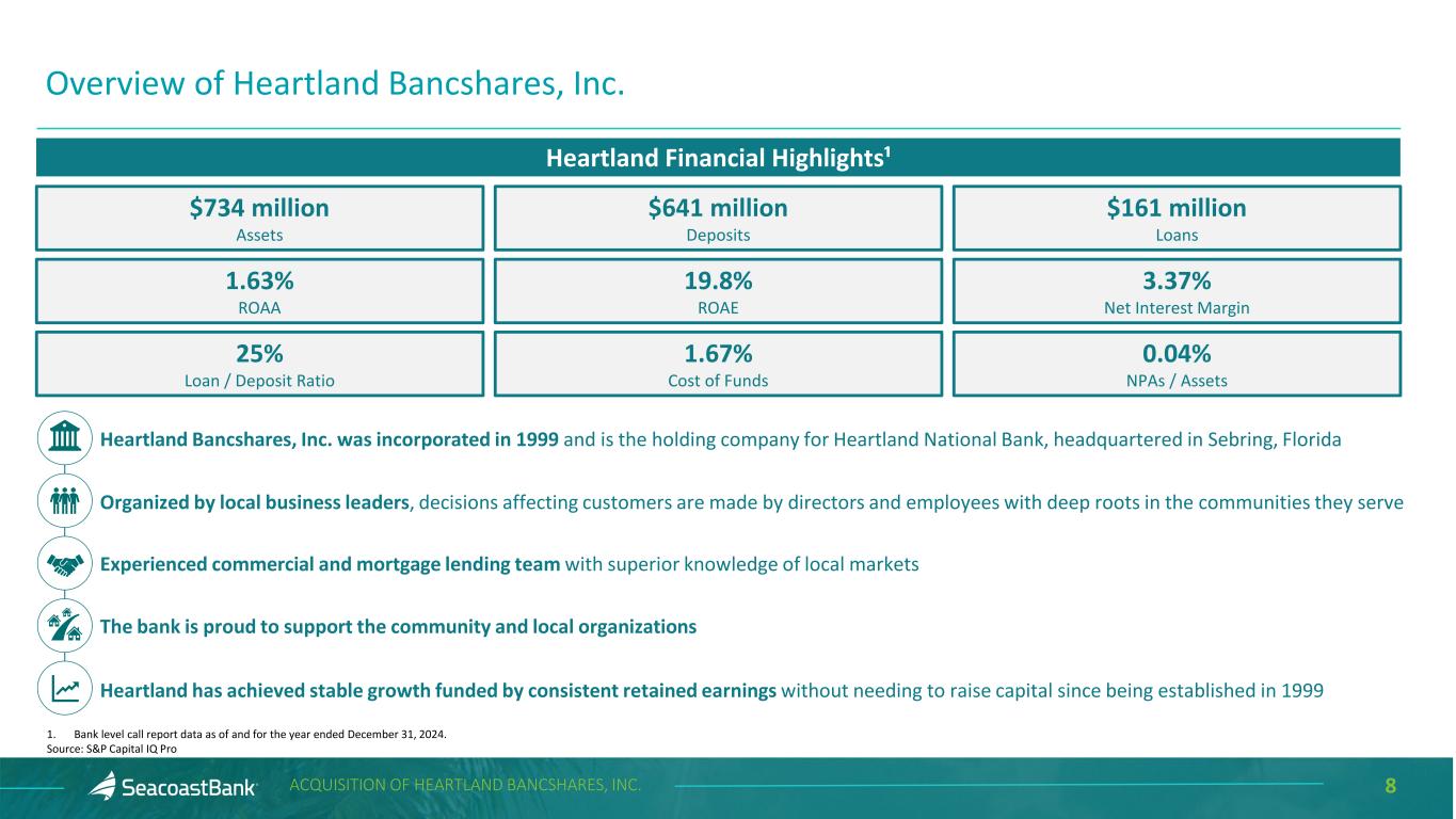 7ACQUISITION OF HEARTLAND BANCSHARES, INC. Heartland Acquisition Establishes Highlands County Presence with #1 Deposit Market Share Heartland Branches (4) Highlands County Seacoast Branches (77) Counties with Seacoast Customers Counties with Seacoast Branches* * Seacoast maintains banking centers, ATMs, and/or loan production offices (LPOs) including an LPO in Atlanta, GA 1. Deposit data as of June 30, 2024 Sources: S&P Capital IQ Pro; FDIC Population Median HH Income County Proj. '25-'30 Growth Proj. '25-'30 Growth Highlands County, FL 3.6% 8.3% Florida 6.0% 10.7% Nationwide 2.4% 8.8% Highlands County, FL Deposit Market Share¹ Branch Market Rank Deposits Count Share Institution (ST) (#) ($000) (#) (%) Heartland Bancshares Inc. (FL) 1 $627,676 4 31.3% SouthState Corp. (FL) 2 267,916 3 13.4% Wells Fargo & Co. (CA) 3 247,829 2 12.4% Truist Financial Corp. (NC) 4 244,757 3 12.2% Crews Banking Corp. (FL) 5 241,821 2 12.1% Bank of America Corporation (NC) 6 221,826 1 11.1% The Toronto-Dominion Bank 7 90,550 1 4.5% FSBH Corp. (FL) 8 59,864 1 3.0% Total For Institutions In Market $2,002,239 17 100.0% Pro Forma Branch Footprint Highlands County, FL Deposit Market Share
