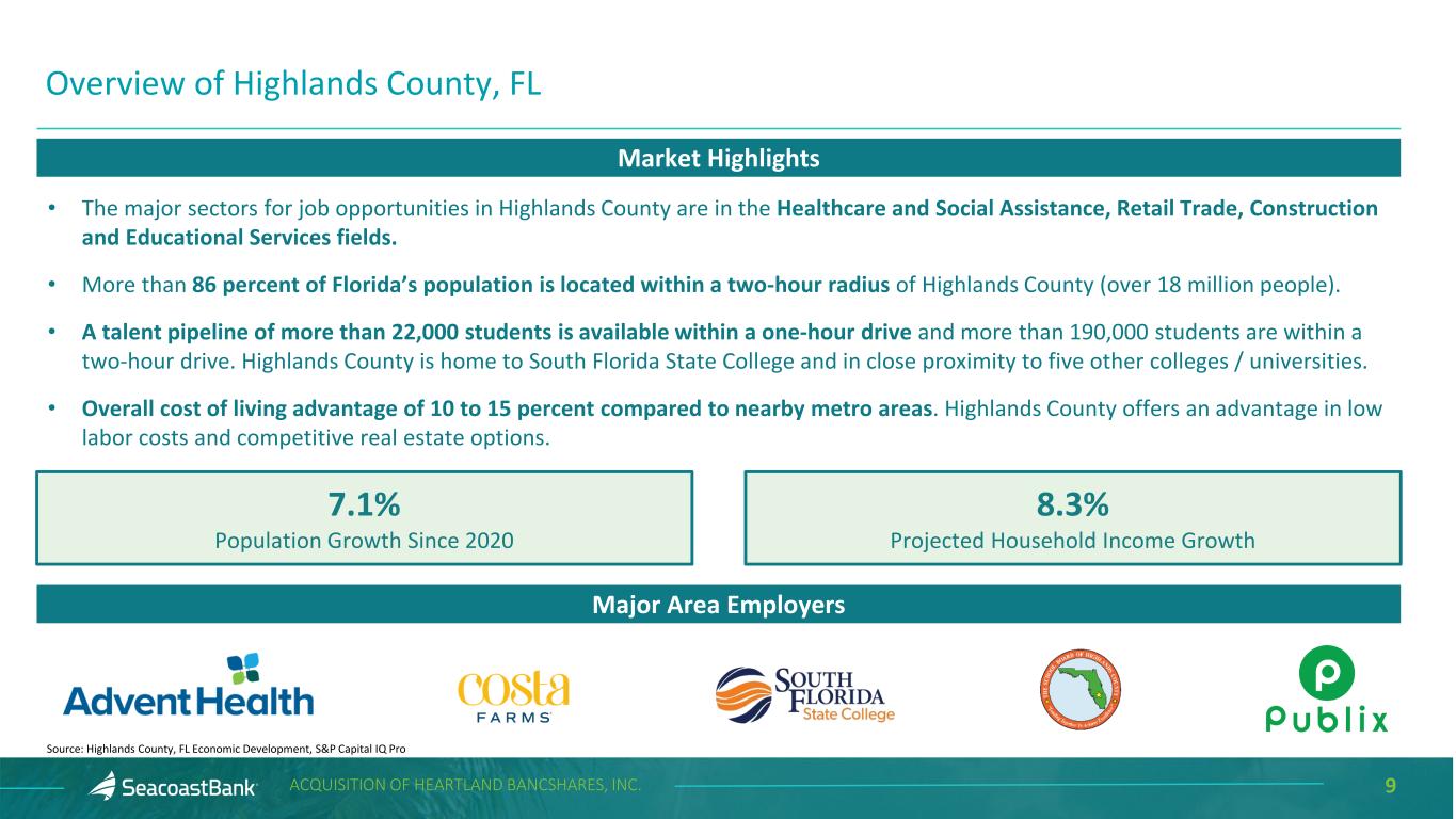 9ACQUISITION OF HEARTLAND BANCSHARES, INC. Overview of Highlands County, FL Market Highlights • The major sectors for job opportunities in Highlands County are in the Healthcare and Social Assistance, Retail Trade, Construction and Educational Services fields. • More than 86 percent of Florida’s population is located within a two-hour radius of Highlands County (over 18 million people). • A talent pipeline of more than 22,000 students is available within a one-hour drive and more than 190,000 students are within a two-hour drive. Highlands County is home to South Florida State College and in close proximity to five other colleges / universities. • Overall cost of living advantage of 10 to 15 percent compared to nearby metro areas. Highlands County offers an advantage in low labor costs and competitive real estate options. Major Area Employers 7.1% Population Growth Since 2020 8.3% Projected Household Income Growth Source: Highlands County, FL Economic Development, S&P Capital IQ Pro