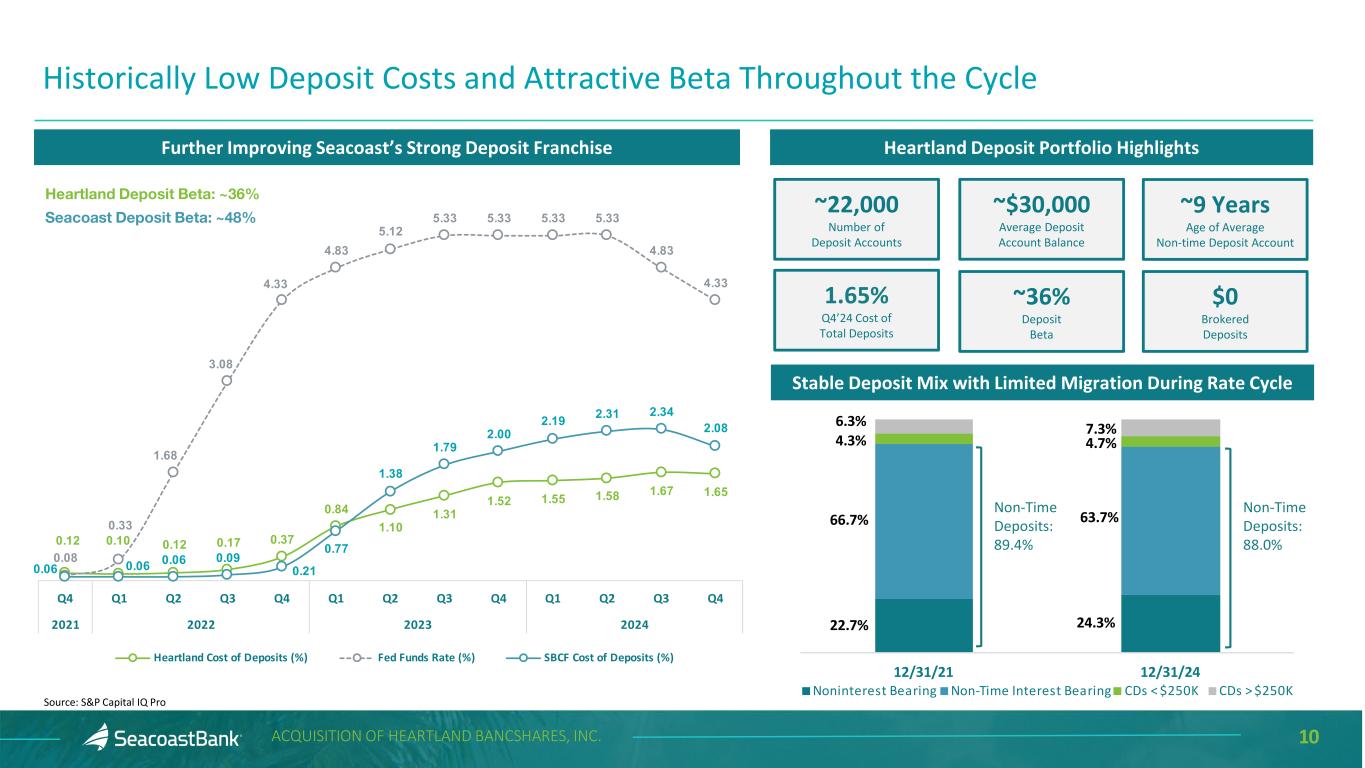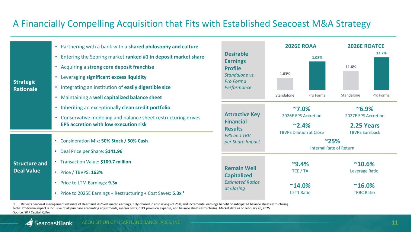 10ACQUISITION OF HEARTLAND BANCSHARES, INC. Historically Low Deposit Costs and Attractive Beta Throughout the Cycle 0.12 0.10 0.12 0.17 0.37 0.84 1.10 1.31 1.52 1.55 1.58 1.67 1.65 0.08 0.33 1.68 3.08 4.33 4.83 5.12 5.33 5.33 5.33 5.33 4.83 4.33 0.06 0.06 0.06 0.09 0.21 0.77 1.38 1.79 2.00 2.19 2.31 2.34 2.08 Q4 Q1 Q2 Q3 Q4 Q1 Q2 Q3 Q4 Q1 Q2 Q3 Q4 2021 2022 2023 2024 Heartland Cost of Deposits (%) Fed Funds Rate (%) SBCF Cost of Deposits (%) ~$30,000 Average Deposit Account Balance ~22,000 Number of Deposit Accounts 1.65% Q4’24 Cost of Total Deposits 22.7% 24.3% 66.7% 63.7% 4.3% 4.7% 6.3% 7.3% 12/31/21 12/31/24 Noninterest Bearing Non-Time Interest Bearing CDs < $250K CDs > $250K Source: S&P Capital IQ Pro Heartland Deposit Beta: ~36% Seacoast Deposit Beta: ~48% Stable Deposit Mix with Limited Migration During Rate Cycle Further Improving Seacoast’s Strong Deposit Franchise Non-Time Deposits: 89.4% Non-Time Deposits: 88.0% ~36% Deposit Beta Heartland Deposit Portfolio Highlights ~9 Years Age of Average Non-time Deposit Account $0 Brokered Deposits