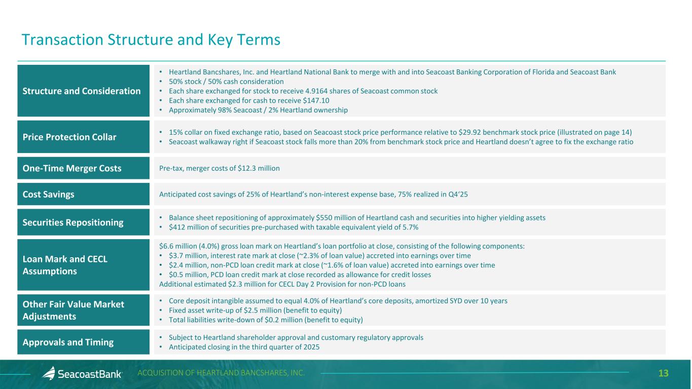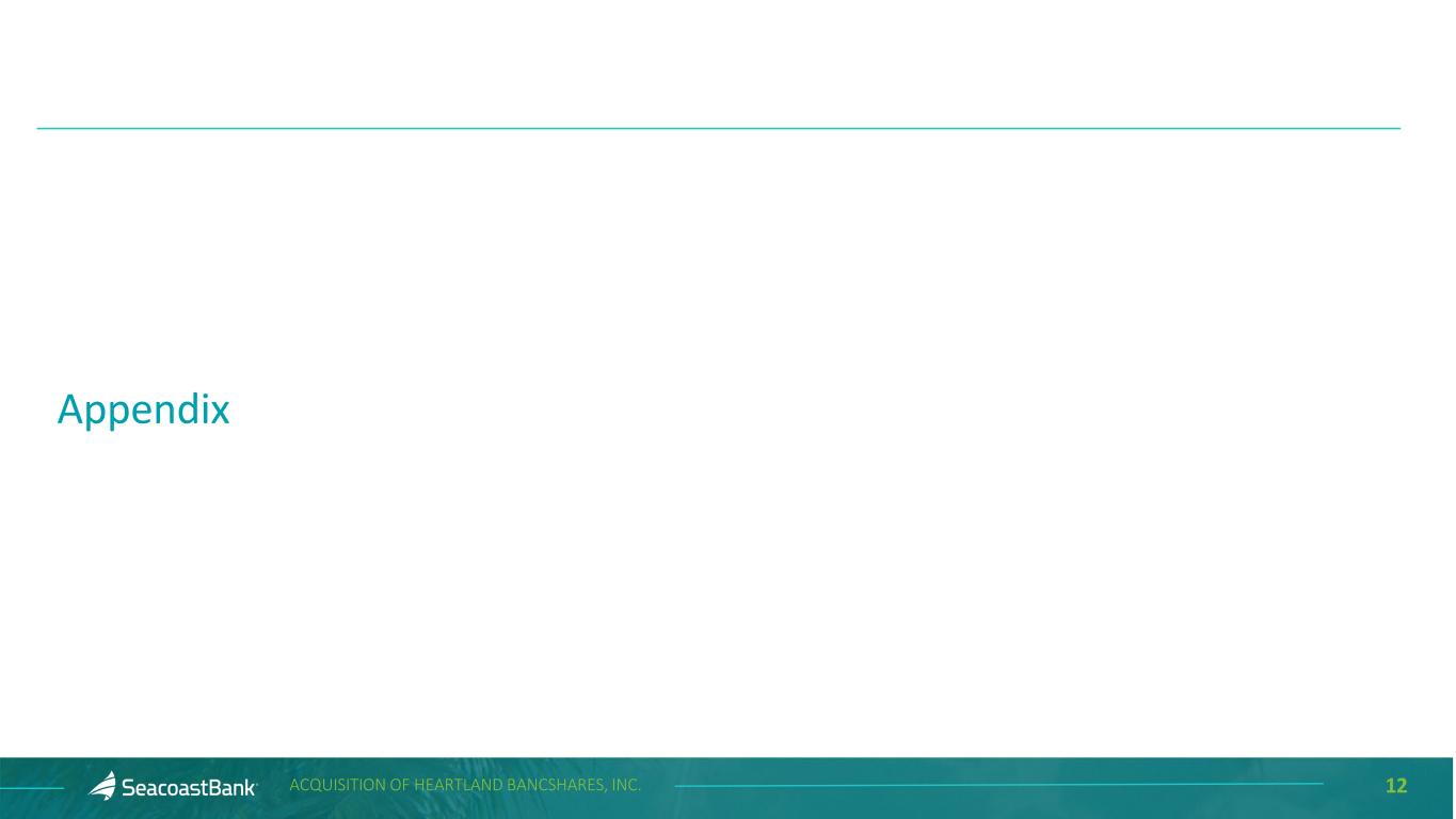 11ACQUISITION OF HEARTLAND BANCSHARES, INC. A Financially Compelling Acquisition that Fits with Established Seacoast M&A Strategy Strategic Rationale • Partnering with a bank with a shared philosophy and culture • Entering the Sebring market ranked #1 in deposit market share • Acquiring a strong core deposit franchise • Leveraging significant excess liquidity • Integrating an institution of easily digestible size • Maintaining a well capitalized balance sheet • Inheriting an exceptionally clean credit portfolio • Conservative modeling and balance sheet restructuring drives EPS accretion with low execution risk Structure and Deal Value • Consideration Mix: 50% Stock / 50% Cash • Deal Price per Share: $141.96 • Transaction Value: $109.7 million • Price / TBVPS: 163% • Price to LTM Earnings: 9.3x • Price to 2025E Earnings + Restructuring + Cost Saves: 5.3x ¹ Attractive Key Financial Results EPS and TBV per Share Impact Desirable Earnings Profile Standalone vs. Pro Forma Performance Remain Well Capitalized Estimated Ratios at Closing ~9.4% TCE / TA ~10.6% Leverage Ratio ~14.0% CET1 Ratio ~16.0% TRBC Ratio ~7.0% 2026E EPS Accretion ~6.9% 2027E EPS Accretion ~2.4% TBVPS Dilution at Close 2.25 Years TBVPS Earnback 2026E ROAA 2026E ROATCE 1.03% 1.08% Standalone Pro Forma 11.6% 12.7% Standalone Pro Forma 1. Reflects Seacoast management estimate of Heartland 2025 estimated earnings, fully-phased in cost savings of 25%, and incremental earnings benefit of anticipated balance sheet restructuring. Note: Pro forma impact is inclusive of all purchase accounting adjustments, merger costs, CECL provision expense, and balance sheet restructuring. Market data as of February 26, 2025. Source: S&P Capital IQ Pro ~25% Internal Rate of Return
