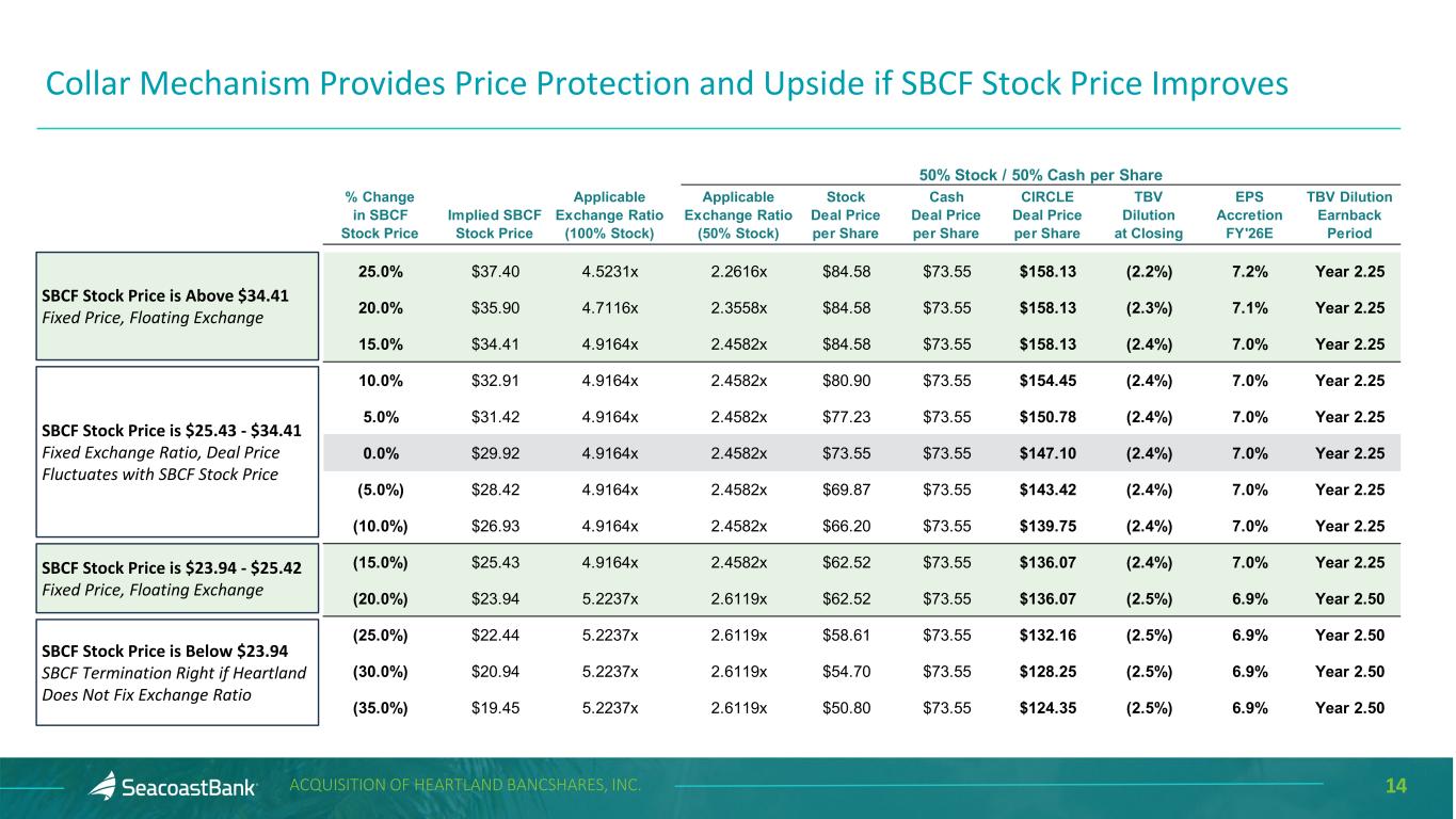 13ACQUISITION OF HEARTLAND BANCSHARES, INC. Transaction Structure and Key Terms • Heartland Bancshares, Inc. and Heartland National Bank to merge with and into Seacoast Banking Corporation of Florida and Seacoast Bank • 50% stock / 50% cash consideration • Each share exchanged for stock to receive 4.9164 shares of Seacoast common stock • Each share exchanged for cash to receive $147.10 • Approximately 98% Seacoast / 2% Heartland ownership Structure and Consideration • Subject to Heartland shareholder approval and customary regulatory approvals • Anticipated closing in the third quarter of 2025Approvals and Timing Pre-tax, merger costs of $12.3 millionOne-Time Merger Costs Anticipated cost savings of 25% of Heartland’s non-interest expense base, 75% realized in Q4‘25Cost Savings $6.6 million (4.0%) gross loan mark on Heartland’s loan portfolio at close, consisting of the following components: • $3.7 million, interest rate mark at close (~2.3% of loan value) accreted into earnings over time • $2.4 million, non-PCD loan credit mark at close (~1.6% of loan value) accreted into earnings over time • $0.5 million, PCD loan credit mark at close recorded as allowance for credit losses Additional estimated $2.3 million for CECL Day 2 Provision for non-PCD loans Loan Mark and CECL Assumptions • Core deposit intangible assumed to equal 4.0% of Heartland’s core deposits, amortized SYD over 10 years • Fixed asset write-up of $2.5 million (benefit to equity) • Total liabilities write-down of $0.2 million (benefit to equity) Other Fair Value Market Adjustments • Balance sheet repositioning of approximately $550 million of Heartland cash and securities into higher yielding assets • $412 million of securities pre-purchased with taxable equivalent yield of 5.7%Securities Repositioning • 15% collar on fixed exchange ratio, based on Seacoast stock price performance relative to $29.92 benchmark stock price (illustrated on page 14) • Seacoast walkaway right if Seacoast stock falls more than 20% from benchmark stock price and Heartland doesn’t agree to fix the exchange ratioPrice Protection Collar