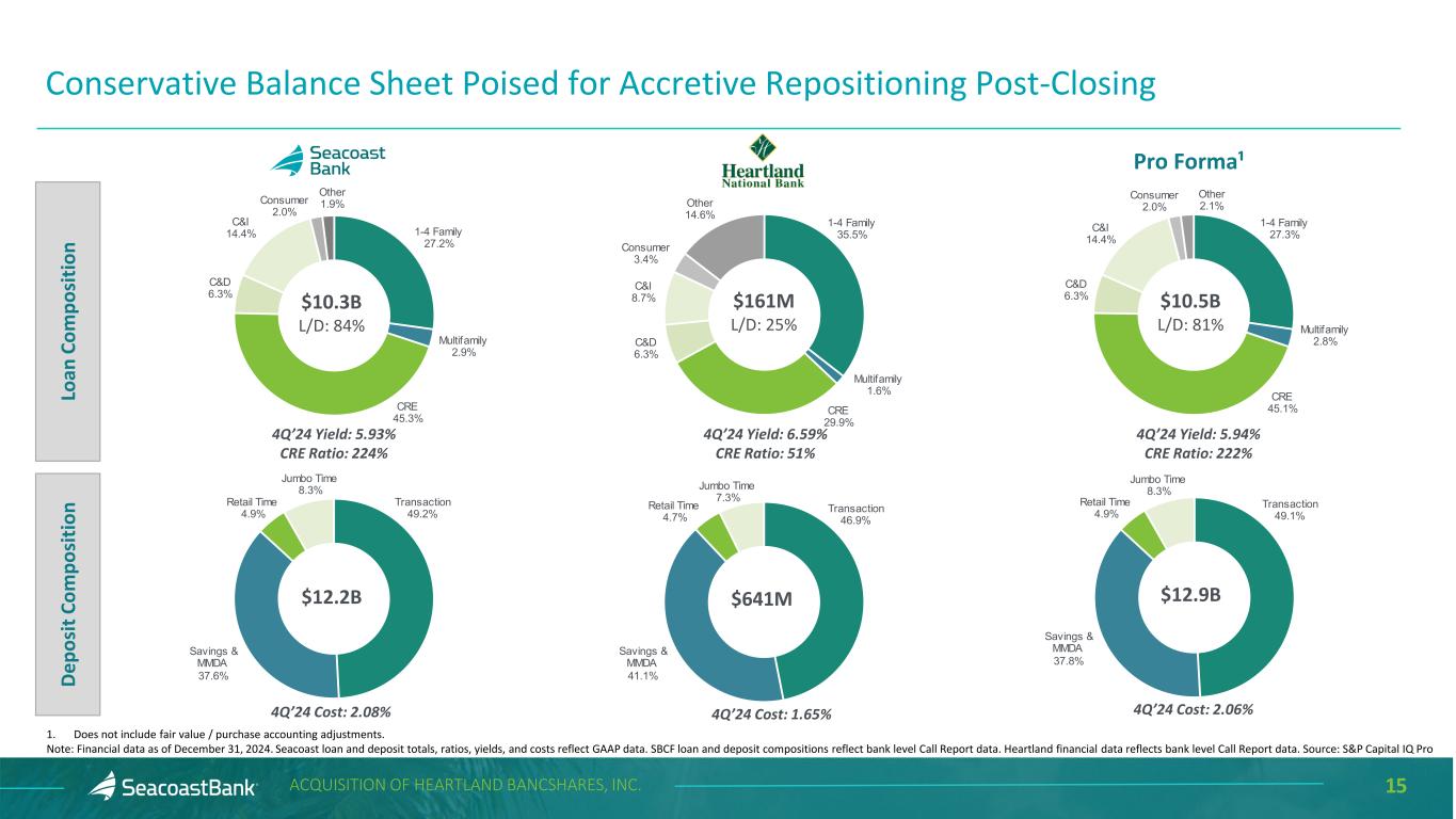 Collar Mechanism Provides Price Protection and Upside if SBCF Stock Price Improves 50% Stock / 50% Cash per Share % Change in SBCF Stock Price Implied SBCF Stock Price Applicable Exchange Ratio (100% Stock) Applicable Exchange Ratio (50% Stock) Stock Deal Price per Share Cash Deal Price per Share CIRCLE Deal Price per Share TBV Dilution at Closing EPS Accretion FY'26E TBV Dilution Earnback Period 25.0% $37.40 4.5231x 2.2616x $84.58 $73.55 $158.13 (2.2%) 7.2% Year 2.25 20.0% $35.90 4.7116x 2.3558x $84.58 $73.55 $158.13 (2.3%) 7.1% Year 2.25 15.0% $34.41 4.9164x 2.4582x $84.58 $73.55 $158.13 (2.4%) 7.0% Year 2.25 10.0% $32.91 4.9164x 2.4582x $80.90 $73.55 $154.45 (2.4%) 7.0% Year 2.25 5.0% $31.42 4.9164x 2.4582x $77.23 $73.55 $150.78 (2.4%) 7.0% Year 2.25 0.0% $29.92 4.9164x 2.4582x $73.55 $73.55 $147.10 (2.4%) 7.0% Year 2.25 (5.0%) $28.42 4.9164x 2.4582x $69.87 $73.55 $143.42 (2.4%) 7.0% Year 2.25 (10.0%) $26.93 4.9164x 2.4582x $66.20 $73.55 $139.75 (2.4%) 7.0% Year 2.25 (15.0%) $25.43 4.9164x 2.4582x $62.52 $73.55 $136.07 (2.4%) 7.0% Year 2.25 (20.0%) $23.94 5.2237x 2.6119x $62.52 $73.55 $136.07 (2.5%) 6.9% Year 2.50 (25.0%) $22.44 5.2237x 2.6119x $58.61 $73.55 $132.16 (2.5%) 6.9% Year 2.50 (30.0%) $20.94 5.2237x 2.6119x $54.70 $73.55 $128.25 (2.5%) 6.9% Year 2.50 (35.0%) $19.45 5.2237x 2.6119x $50.80 $73.55 $124.35 (2.5%) 6.9% Year 2.50 SBCF Stock Price is Above $34.41 Fixed Price, Floating Exchange SBCF Stock Price is $25.43 - $34.41 Fixed Exchange Ratio, Deal Price Fluctuates with SBCF Stock Price SBCF Stock Price is $23.94 - $25.42 Fixed Price, Floating Exchange SBCF Stock Price is Below $23.94 SBCF Termination Right if Heartland Does Not Fix Exchange Ratio 14ACQUISITION OF HEARTLAND BANCSHARES, INC.