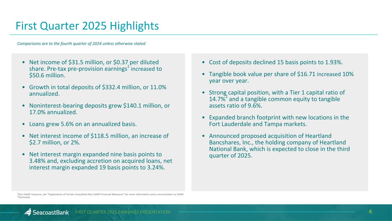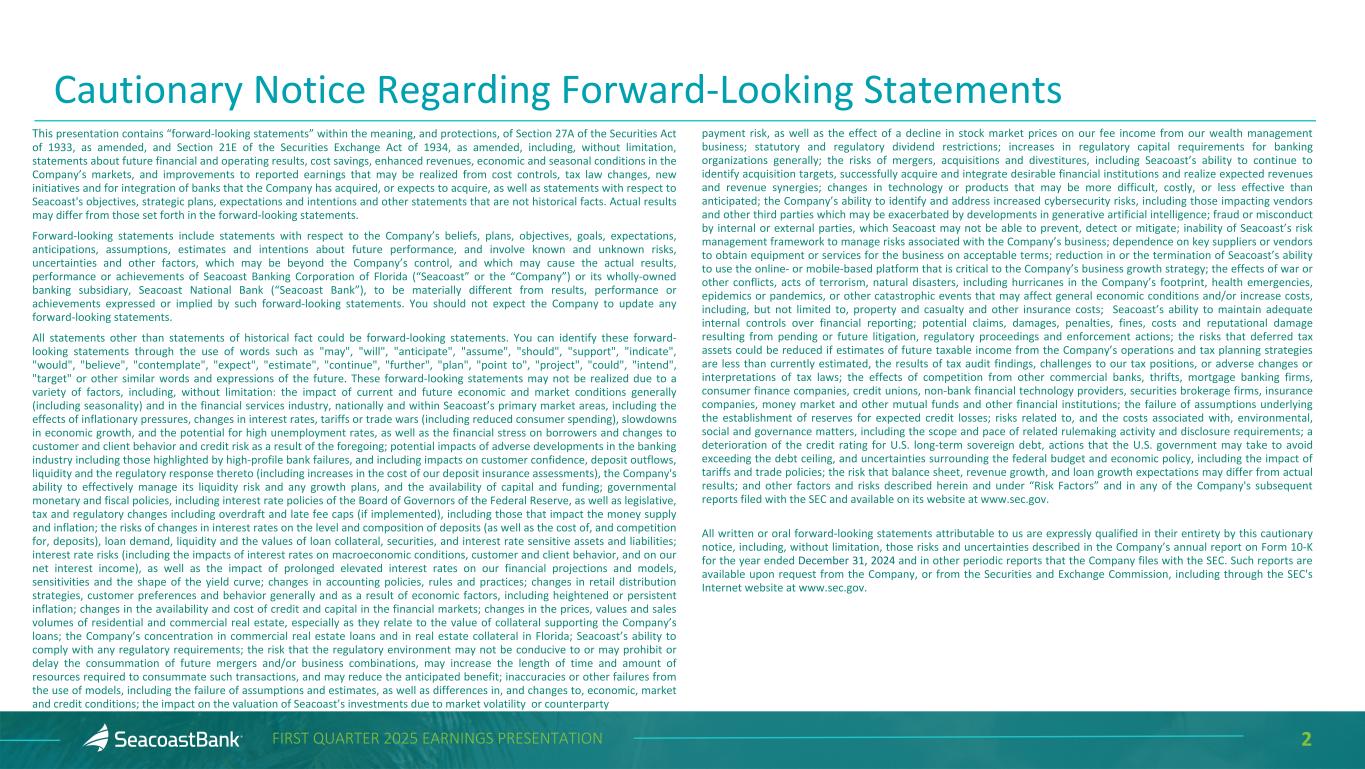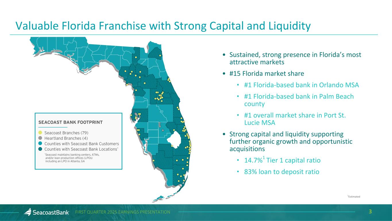 2FIRST QUARTER 2025 EARNINGS PRESENTATION Cautionary Notice Regarding Forward-Looking Statements This presentation contains “forward-looking statements” within the meaning, and protections, of Section 27A of the Securities Act of 1933, as amended, and Section 21E of the Securities Exchange Act of 1934, as amended, including, without limitation, statements about future financial and operating results, cost savings, enhanced revenues, economic and seasonal conditions in the Company’s markets, and improvements to reported earnings that may be realized from cost controls, tax law changes, new initiatives and for integration of banks that the Company has acquired, or expects to acquire, as well as statements with respect to Seacoast's objectives, strategic plans, expectations and intentions and other statements that are not historical facts. Actual results may differ from those set forth in the forward-looking statements. Forward-looking statements include statements with respect to the Company’s beliefs, plans, objectives, goals, expectations, anticipations, assumptions, estimates and intentions about future performance, and involve known and unknown risks, uncertainties and other factors, which may be beyond the Company’s control, and which may cause the actual results, performance or achievements of Seacoast Banking Corporation of Florida (“Seacoast” or the “Company”) or its wholly-owned banking subsidiary, Seacoast National Bank (“Seacoast Bank”), to be materially different from results, performance or achievements expressed or implied by such forward-looking statements. You should not expect the Company to update any forward-looking statements. All statements other than statements of historical fact could be forward-looking statements. You can identify these forward- looking statements through the use of words such as "may", "will", "anticipate", "assume", "should", "support", "indicate", "would", "believe", "contemplate", "expect", "estimate", "continue", "further", "plan", "point to", "project", "could", "intend", "target" or other similar words and expressions of the future. These forward-looking statements may not be realized due to a variety of factors, including, without limitation: the impact of current and future economic and market conditions generally (including seasonality) and in the financial services industry, nationally and within Seacoast’s primary market areas, including the effects of inflationary pressures, changes in interest rates, tariffs or trade wars (including reduced consumer spending), slowdowns in economic growth, and the potential for high unemployment rates, as well as the financial stress on borrowers and changes to customer and client behavior and credit risk as a result of the foregoing; potential impacts of adverse developments in the banking industry including those highlighted by high-profile bank failures, and including impacts on customer confidence, deposit outflows, liquidity and the regulatory response thereto (including increases in the cost of our deposit insurance assessments), the Company's ability to effectively manage its liquidity risk and any growth plans, and the availability of capital and funding; governmental monetary and fiscal policies, including interest rate policies of the Board of Governors of the Federal Reserve, as well as legislative, tax and regulatory changes including overdraft and late fee caps (if implemented), including those that impact the money supply and inflation; the risks of changes in interest rates on the level and composition of deposits (as well as the cost of, and competition for, deposits), loan demand, liquidity and the values of loan collateral, securities, and interest rate sensitive assets and liabilities; interest rate risks (including the impacts of interest rates on macroeconomic conditions, customer and client behavior, and on our net interest income), as well as the impact of prolonged elevated interest rates on our financial projections and models, sensitivities and the shape of the yield curve; changes in accounting policies, rules and practices; changes in retail distribution strategies, customer preferences and behavior generally and as a result of economic factors, including heightened or persistent inflation; changes in the availability and cost of credit and capital in the financial markets; changes in the prices, values and sales volumes of residential and commercial real estate, especially as they relate to the value of collateral supporting the Company’s loans; the Company’s concentration in commercial real estate loans and in real estate collateral in Florida; Seacoast’s ability to comply with any regulatory requirements; the risk that the regulatory environment may not be conducive to or may prohibit or delay the consummation of future mergers and/or business combinations, may increase the length of time and amount of resources required to consummate such transactions, and may reduce the anticipated benefit; inaccuracies or other failures from the use of models, including the failure of assumptions and estimates, as well as differences in, and changes to, economic, market and credit conditions; the impact on the valuation of Seacoast’s investments due to market volatility or counterparty payment risk, as well as the effect of a decline in stock market prices on our fee income from our wealth management business; statutory and regulatory dividend restrictions; increases in regulatory capital requirements for banking organizations generally; the risks of mergers, acquisitions and divestitures, including Seacoast’s ability to continue to identify acquisition targets, successfully acquire and integrate desirable financial institutions and realize expected revenues and revenue synergies; changes in technology or products that may be more difficult, costly, or less effective than anticipated; the Company’s ability to identify and address increased cybersecur