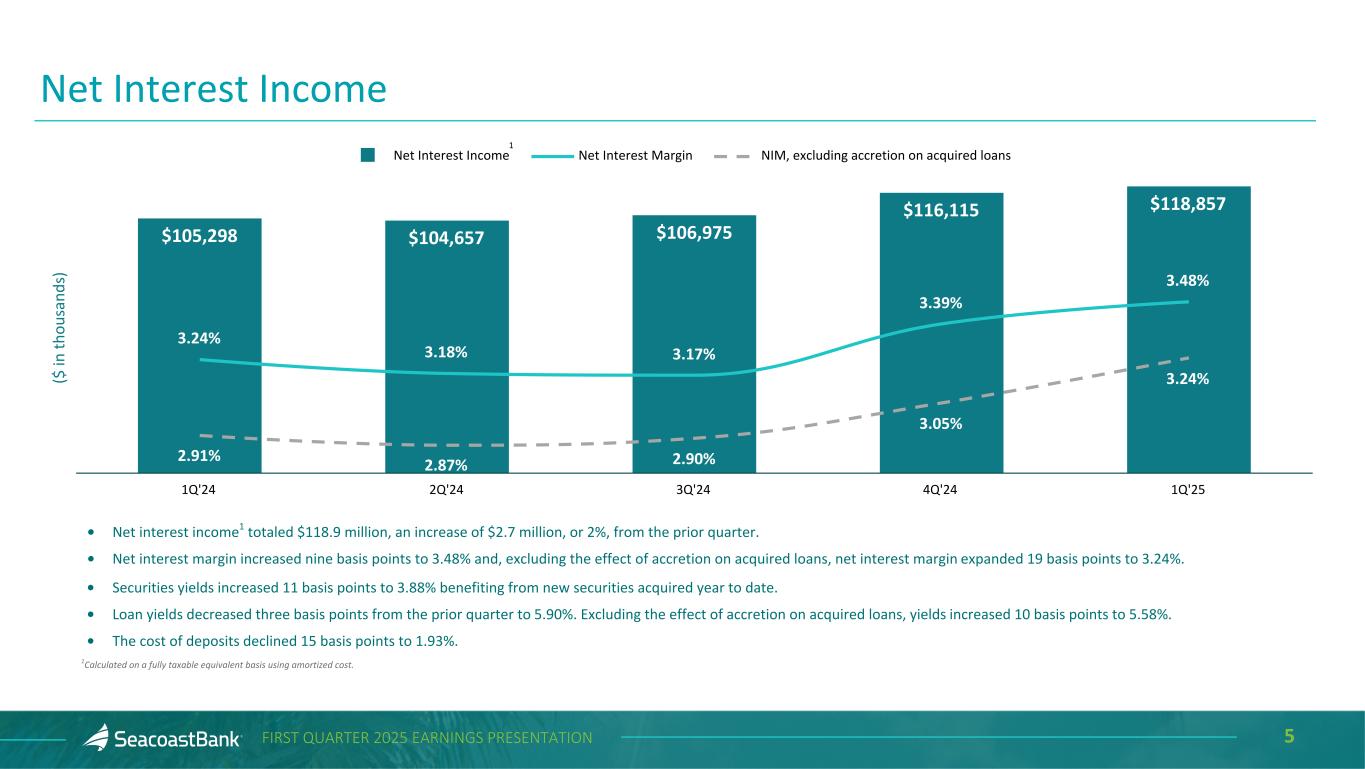 4FIRST QUARTER 2025 EARNINGS PRESENTATION • Net income of $31.5 million, or $0.37 per diluted share. Pre-tax pre-provision earnings1 increased to $50.6 million. • Growth in total deposits of $332.4 million, or 11.0% annualized. • Noninterest-bearing deposits grew $140.1 million, or 17.0% annualized. • Loans grew 5.6% on an annualized basis. • Net interest income of $118.5 million, an increase of $2.7 million, or 2%. • Net interest margin expanded nine basis points to 3.48% and, excluding accretion on acquired loans, net interest margin expanded 19 basis points to 3.24%. First Quarter 2025 Highlights Comparisons are to the fourth quarter of 2024 unless otherwise stated • Cost of deposits declined 15 basis points to 1.93%. • Tangible book value per share of $16.71 increased 10% year over year. • Strong capital position, with a Tier 1 capital ratio of 14.7%2 and a tangible common equity to tangible assets ratio of 9.6%. • Expanded branch footprint with new locations in the Fort Lauderdale and Tampa markets. • Announced proposed acquisition of Heartland Bancshares, Inc., the holding company of Heartland National Bank, which is expected to close in the third quarter of 2025. 1Non-GAAP measure, see “Explanation of Certain Unaudited Non-GAAP Financial Measures" for more information and a reconciliation to GAAP. 2Estimated