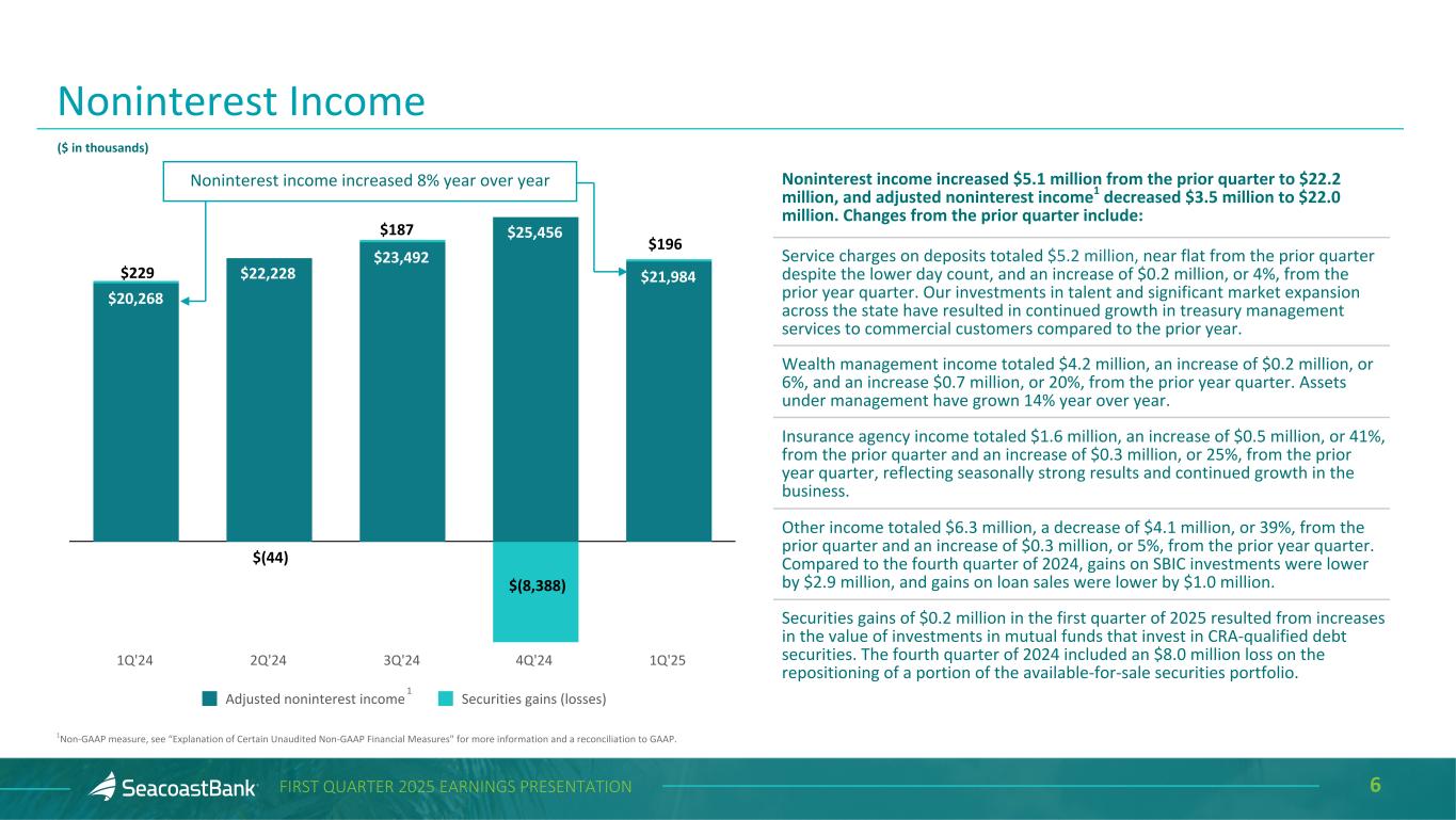 5FIRST QUARTER 2025 EARNINGS PRESENTATION Net Interest Income ($ in th ou sa nd s) $105,298 $104,657 $106,975 $116,115 $118,857 3.24% 3.18% 3.17% 3.39% 3.48% 2.91% 2.87% 2.90% 3.05% 3.24% Net Interest Income Net Interest Margin NIM, excluding accretion on acquired loans 1Q'24 2Q'24 3Q'24 4Q'24 1Q'25 • Net interest income1 totaled $118.9 million, an increase of $2.7 million, or 2%, from the prior quarter. • Net interest margin increased nine basis points to 3.48% and, excluding the effect of accretion on acquired loans, net interest margin expanded 19 basis points to 3.24%. • Securities yields increased 11 basis points to 3.88% benefiting from new securities acquired year to date. • Loan yields decreased three basis points from the prior quarter to 5.90%. Excluding the effect of accretion on acquired loans, yields increased 10 basis points to 5.58%. • The cost of deposits declined 15 basis points to 1.93%. 1Calculated on a fully taxable equivalent basis using amortized cost. 1