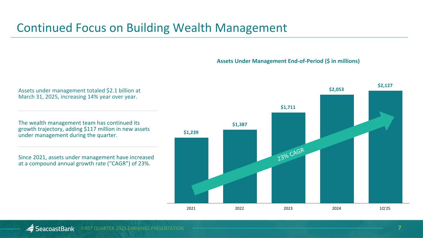 6FIRST QUARTER 2025 EARNINGS PRESENTATION Noninterest income increased $5.1 million from the prior quarter to $22.2 million, and adjusted noninterest income1 decreased $3.5 million to $22.0 million. Changes from the prior quarter include: Service charges on deposits totaled $5.2 million, near flat from the prior quarter despite the lower day count, and an increase of $0.2 million, or 4%, from the prior year quarter. Our investments in talent and significant market expansion across the state have resulted in continued growth in treasury management services to commercial customers compared to the prior year. Wealth management income totaled $4.2 million, an increase of $0.2 million, or 6%, and an increase $0.7 million, or 20%, from the prior year quarter. Assets under management have grown 14% year over year. Insurance agency income totaled $1.6 million, an increase of $0.5 million, or 41%, from the prior quarter and an increase of $0.3 million, or 25%, from the prior year quarter, reflecting seasonally strong results and continued growth in the business. Other income totaled $6.3 million, a decrease of $4.1 million, or 39%, from the prior quarter and an increase of $0.3 million, or 5%, from the prior year quarter. Compared to the fourth quarter of 2024, gains on SBIC investments were lower by $2.9 million, and gains on loan sales were lower by $1.0 million. Securities gains of $0.2 million in the first quarter of 2025 resulted from increases in the value of investments in mutual funds that invest in CRA-qualified debt securities. The fourth quarter of 2024 included an $8.0 million loss on the repositioning of a portion of the available-for-sale securities portfolio. 1Non-GAAP measure, see “Explanation of Certain Unaudited Non-GAAP Financial Measures" for more information and a reconciliation to GAAP. Noninterest Income $20,268 $22,228 $23,492 $25,456 $21,984 Adjusted noninterest income Securities gains (losses) 1Q'24 2Q'24 3Q'24 4Q'24 1Q'25 ($ in thousands) $229 $(44) $196 Noninterest income increased 8% year over year 1 $187 $(8,388)