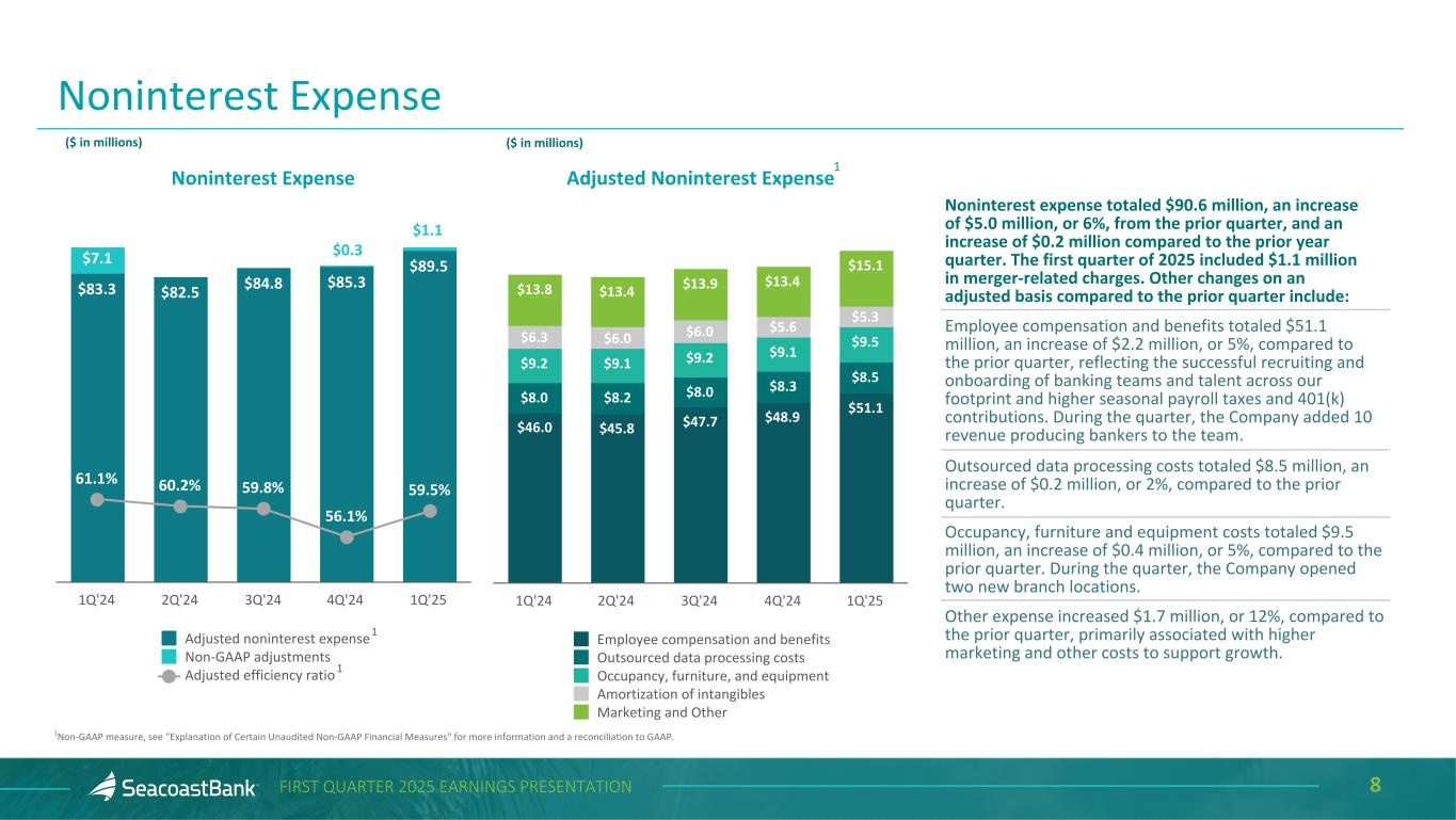 7FIRST QUARTER 2025 EARNINGS PRESENTATION Assets Under Management End-of-Period ($ in millions) $1,239 $1,387 $1,711 $2,053 $2,127 2021 2022 2023 2024 1Q’25 Continued Focus on Building Wealth Management Assets under management totaled $2.1 billion at March 31, 2025, increasing 14% year over year. The wealth management team has continued its growth trajectory, adding $117 million in new assets under management during the quarter. Since 2021, assets under management have increased at a compound annual growth rate (“CAGR”) of 23%. 23% CAG R