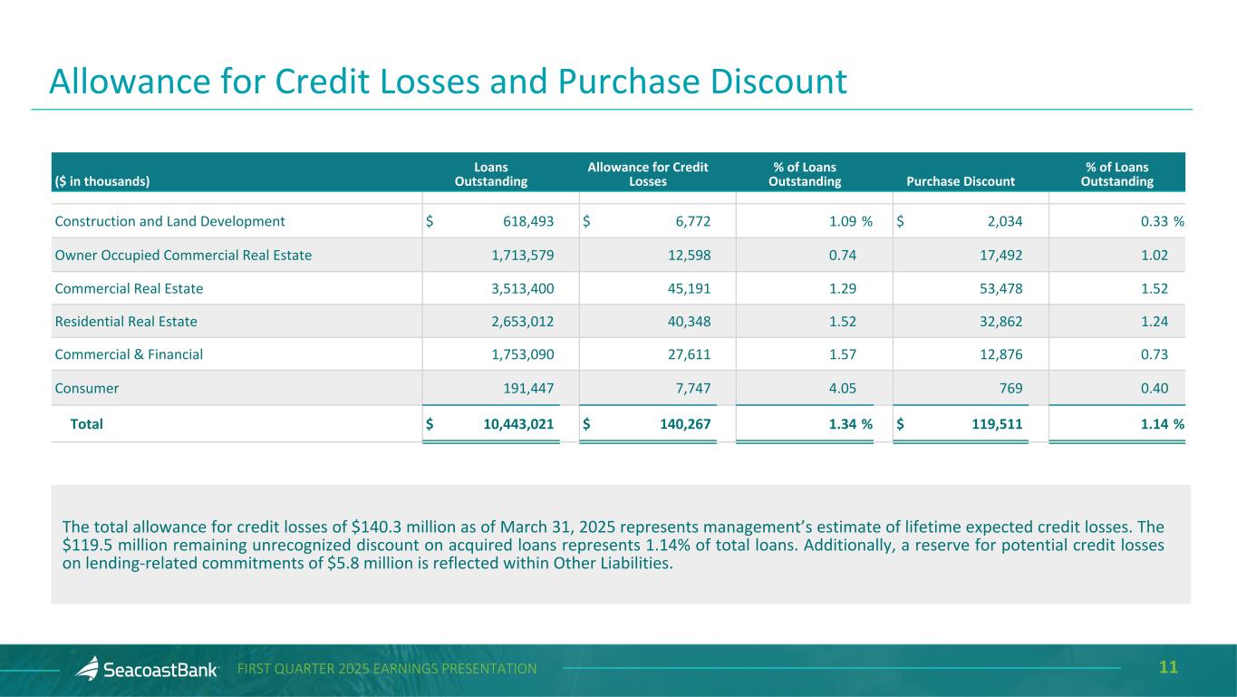 10FIRST QUARTER 2025 EARNINGS PRESENTATION At March 31, 2025 Loan Portfolio Mix Seacoast's lending strategy results in a diverse and granular loan portfolio. Seacoast’s average loan size is $426 thousand and the average commercial loan size is $838 thousand. Portfolio diversification in terms of asset mix, industry, and loan type has been a critical element of the Company’s lending strategy. Exposures across industries and collateral types are broadly distributed. Construction and land development and commercial real estate loans, as defined in regulatory guidance, represent 34% and 220%, respectively, of total consolidated risk-based capital1. CRE-Retail, 11% CRE-Office, 5% CRE-Multifamily 5+, 4% CRE-Hotel/Motel, 3% CRE-Industrial/Warehouse, 5% CRE-Other, 6% OOCRE, 16% Construction & Land Development, 6% Commercial & Financial, 17% Residential, 25% Consumer, 2% 1Estimated