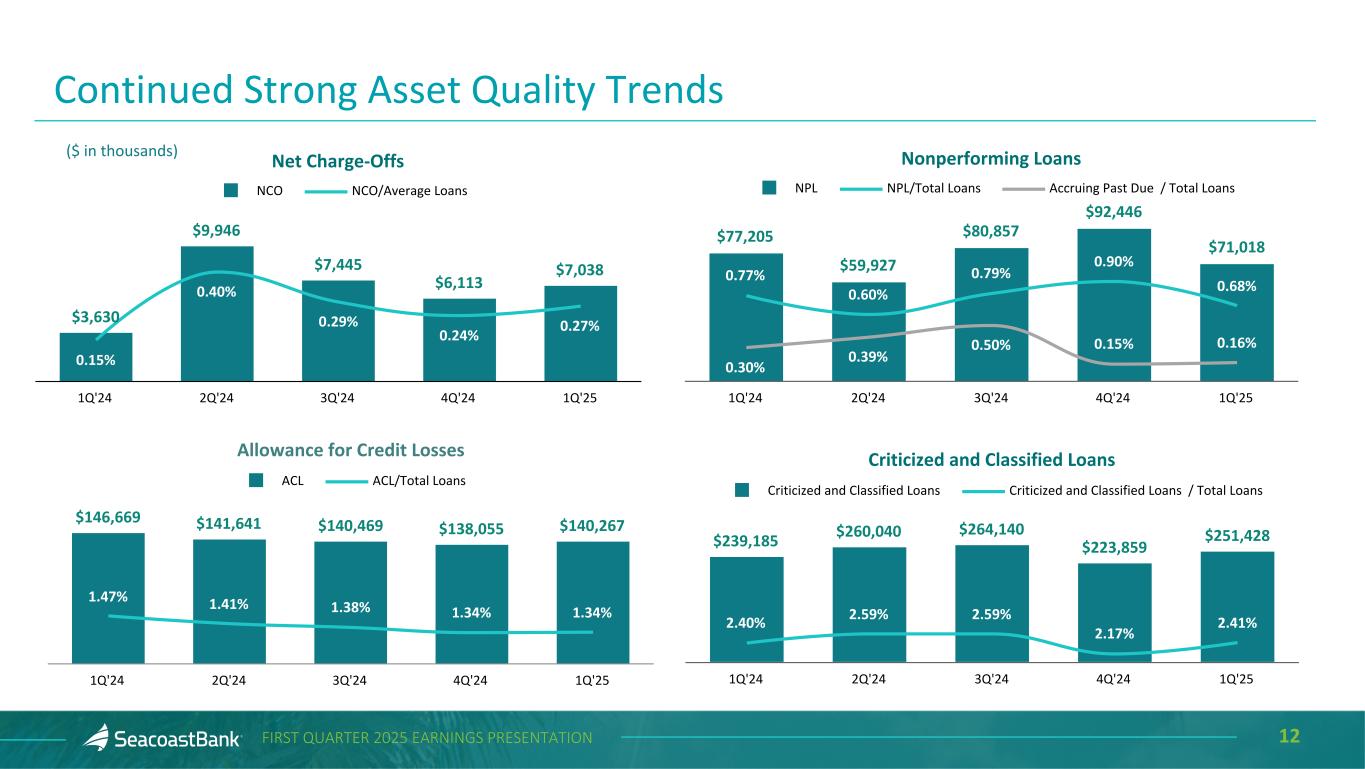11FIRST QUARTER 2025 EARNINGS PRESENTATION Allowance for Credit Losses and Purchase Discount ($ in thousands) Loans Outstanding Allowance for Credit Losses % of Loans Outstanding Purchase Discount % of Loans Outstanding Construction and Land Development $ 618,493 $ 6,772 1.09 % $ 2,034 0.33 % Owner Occupied Commercial Real Estate 1,713,579 12,598 0.74 17,492 1.02 Commercial Real Estate 3,513,400 45,191 1.29 53,478 1.52 Residential Real Estate 2,653,012 40,348 1.52 32,862 1.24 Commercial & Financial 1,753,090 27,611 1.57 12,876 0.73 Consumer 191,447 7,747 4.05 769 0.40 Total $ 10,443,021 $ 140,267 1.34 % $ 119,511 1.14 % The total allowance for credit losses of $140.3 million as of March 31, 2025 represents management’s estimate of lifetime expected credit losses. The $119.5 million remaining unrecognized discount on acquired loans represents 1.14% of total loans. Additionally, a reserve for potential credit losses on lending-related commitments of $5.8 million is reflected within Other Liabilities.