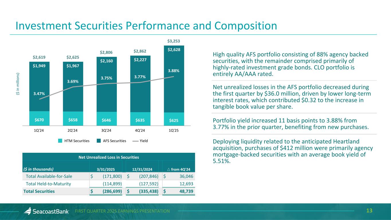 12FIRST QUARTER 2025 EARNINGS PRESENTATION Net Charge-Offs $3,630 $9,946 $7,445 $6,113 $7,038 0.15% 0.40% 0.29% 0.24% 0.27% NCO NCO/Average Loans 1Q'24 2Q'24 3Q'24 4Q'24 1Q'25 ($ in thousands) Allowance for Credit Losses $146,669 $141,641 $140,469 $138,055 $140,267 1.47% 1.41% 1.38% 1.34% 1.34% ACL ACL/Total Loans 1Q'24 2Q'24 3Q'24 4Q'24 1Q'25 Continued Strong Asset Quality Trends Nonperforming Loans $77,205 $59,927 $80,857 $92,446 $71,018 0.77% 0.60% 0.79% 0.90% 0.68% 0.30% 0.39% 0.50% 0.15% 0.16% NPL NPL/Total Loans Accruing Past Due / Total Loans 1Q'24 2Q'24 3Q'24 4Q'24 1Q'25 Criticized and Classified Loans $239,185 $260,040 $264,140 $223,859 $251,428 2.40% 2.59% 2.59% 2.17% 2.41% Criticized and Classified Loans Criticized and Classified Loans / Total Loans 1Q'24 2Q'24 3Q'24 4Q'24 1Q'25