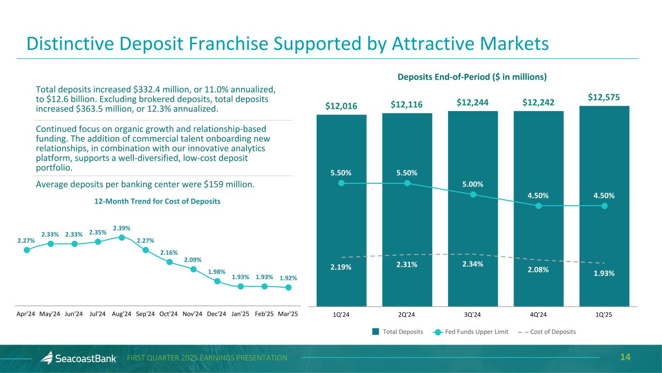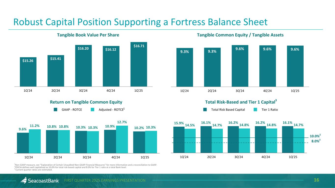 15FIRST QUARTER 2025 EARNINGS PRESENTATION Deposits End-of-Period ($ in millions) $12,016 $12,116 $12,244 $12,242 $12,575 Transaction Accounts Savings Money Market Brokered Time Deposits 1Q'24 2Q'24 3Q'24 4Q'24 1Q'25 Granular, Diverse and Relationship-Focused Customer Funding Base The Company benefits from a granular deposit franchise, with the top ten depositors representing approximately 3% of total deposits. Customer transaction account balances represent 50% of total deposits. Consumer deposits represent 41% of total deposits, with an average balance per account of $26 thousand. Business deposits represent 59% of total deposits, with an average balance per account of $115 thousand. The average tenure for a Seacoast customer is 10 years. 50%50%49%50%52% 4% 4%4%5%5% 29% 30% 33% 33% 33% 1% 3% 2% 2% 2%13% 12% 12% 11% 11%