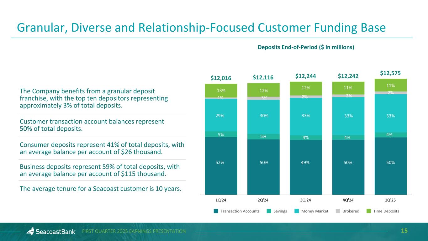 14FIRST QUARTER 2025 EARNINGS PRESENTATION Deposits End-of-Period ($ in millions) $12,016 $12,116 $12,244 $12,242 $12,575 5.50% 5.50% 5.00% 4.50% 4.50% 2.19% 2.31% 2.34% 2.08% 1.93% Total Deposits Fed Funds Upper Limit Cost of Deposits 1Q'24 2Q'24 3Q'24 4Q'24 1Q'25 Distinctive Deposit Franchise Supported by Attractive Markets Total deposits increased $332.4 million, or 11.0% annualized, to $12.6 billion. Excluding brokered deposits, total deposits increased $363.5 million, or 12.3% annualized. Continued focus on organic growth and relationship-based funding. The addition of commercial talent onboarding new relationships, in combination with our innovative analytics platform, supports a well-diversified, low-cost deposit portfolio. Average deposits per banking center were $159 million. 12-Month Trend for Cost of Deposits 2.27% 2.33% 2.33% 2.35% 2.39% 2.27% 2.16% 2.09% 1.98% 1.93% 1.93% 1.92% Apr'24 May'24 Jun'24 Jul'24 Aug'24 Sep'24 Oct'24 Nov'24 Dec'24 Jan'25 Feb'25 Mar'25