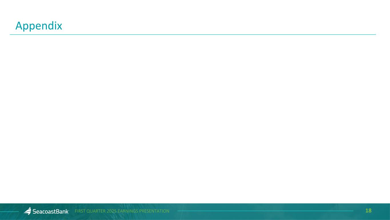 16FIRST QUARTER 2025 EARNINGS PRESENTATION $15.26 $15.41 $16.20 $16.12 1Q'24 2Q'24 3Q'24 4Q'24 1Q'25 9.3% 9.3% 9.6% 9.6% 9.6% 1Q'24 2Q'24 3Q'24 4Q'24 1Q'25 15.9% 16.1% 16.2% 16.2% 16.1% 14.5% 14.7% 14.8% 14.8% 14.7% Total Risk Based Capital Tier 1 Ratio 1Q'24 2Q'24 3Q'24 4Q'24 1Q'25 9.6% 10.8% 10.3% 10.9% 10.2%11.2% 10.8% 10.3% 12.7% 10.3% GAAP - ROTCE Adjusted - ROTCE 1Q'24 2Q'24 3Q'24 4Q'24 1Q'25 1Non-GAAP measure, see “Explanation of Certain Unaudited Non-GAAP Financial Measures" for more information and a reconciliation to GAAP. 2FDICIA defines well capitalized as 10.0% for total risk-based capital and 8.0% for Tier 1 ratio at a total Bank level. 3 Current quarter ratios are estimated. Tangible Book Value Per Share Tangible Common Equity / Tangible Assets Total Risk-Based and Tier 1 Capital3Return on Tangible Common Equity 1 10.0%2 8.0%2 Robust Capital Position Supporting a Fortress Balance Sheet $16.71
