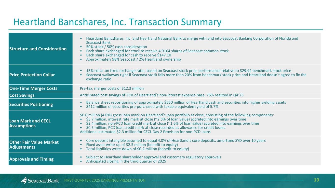 19FIRST QUARTER 2025 EARNINGS PRESENTATION Heartland Bancshares, Inc. Transaction Summary Structure and Consideration • Heartland Bancshares, Inc. and Heartland National Bank to merge with and into Seacoast Banking Corporation of Florida and Seacoast Bank • 50% stock / 50% cash consideration • Each share exchanged for stock to receive 4.9164 shares of Seacoast common stock • Each share exchanged for cash to receive $147.10 • Approximately 98% Seacoast / 2% Heartland ownership Price Protection Collar • 15% collar on fixed exchange ratio, based on Seacoast stock price performance relative to $29.92 benchmark stock price • Seacoast walkaway right if Seacoast stock falls more than 20% from benchmark stock price and Heartland doesn’t agree to fix the exchange ratio One-Time Merger Costs Pre-tax, merger costs of $12.3 million Cost Savings Anticipated cost savings of 25% of Heartland’s non-interest expense base, 75% realized in Q4‘25 Securities Positioning • Balance sheet repositioning of approximately $550 million of Heartland cash and securities into higher yielding assets • $412 million of securities pre-purchased with taxable equivalent yield of 5.7% Loan Mark and CECL Assumptions $6.6 million (4.0%) gross loan mark on Heartland’s loan portfolio at close, consisting of the following components: • $3.7 million, interest rate mark at close (~2.3% of loan value) accreted into earnings over time • $2.4 million, non-PCD loan credit mark at close (~1.6% of loan value) accreted into earnings over time • $0.5 million, PCD loan credit mark at close recorded as allowance for credit losses Additional estimated $2.3 million for CECL Day 2 Provision for non-PCD loans Other Fair Value Market Adjustments • Core deposit intangible assumed to equal 4.0% of Heartland’s core deposits, amortized SYD over 10 years • Fixed asset write-up of $2.5 million (benefit to equity) • Total liabilities write-down of $0.2 million (benefit to equity) Approvals and Timing • Subject to Heartland shareholder approval and customary regulatory approvals • Anticipated closing in the third quarter of 2025
