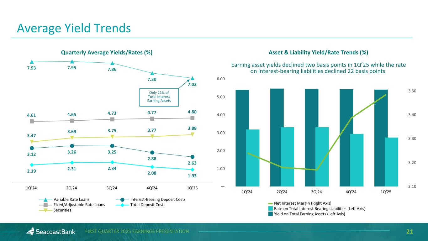 20FIRST QUARTER 2025 EARNINGS PRESENTATION Quarterly Trend ($ in thousands) 1Q'25 4Q'24 3Q'24 2Q'24 1Q'24 Commercial pipeline at period end $ 884,878 $ 605,357 $ 744,548 $ 743,789 $ 498,617 Commercial loan originations 405,449 711,506 499,655 405,957 260,032 SBA pipeline at period end 19,233 28,793 28,944 29,296 15,630 SBA originations 17,388 36,836 18,386 8,226 18,944 Residential pipeline-saleable at period end 15,495 6,727 11,222 12,095 9,279 Residential loans-sold 15,531 11,764 23,200 21,417 15,305 Residential pipeline-portfolio at period end 37,532 35,068 21,920 24,721 24,364 Residential loans-retained 70,322 99,916 51,507 42,431 51,435 Consumer pipeline at period end 24,433 17,384 24,447 24,532 25,057 Consumer originations 46,732 42,607 65,140 59,973 48,244 Total Pipelines at Period End $ 981,571 $ 693,329 $ 831,081 $ 834,433 $ 572,947 Total Originations $ 555,422 $ 902,629 $ 657,888 $ 538,004 $ 393,960 Loan Production and Pipeline Trend