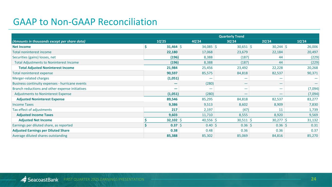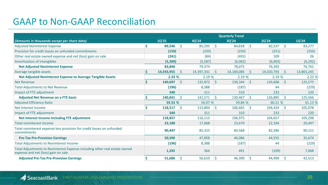 24FIRST QUARTER 2025 EARNINGS PRESENTATION Quarterly Trend (Amounts in thousands except per share data) 1Q'25 4Q'24 3Q'24 2Q'24 1Q'24 Net Income $ 31,464 $ 34,085 $ 30,651 $ 30,244 $ 26,006 Total noninterest income 22,180 17,068 23,679 22,184 20,497 Securities (gains) losses, net (196) 8,388 (187) 44 (229) Total Adjustments to Noninterest Income (196) 8,388 (187) 44 (229) Total Adjusted Noninterest Income 21,984 25,456 23,492 22,228 20,268 Total noninterest expense 90,597 85,575 84,818 82,537 90,371 Merger-related charges (1,051) — — — — Business continuity expenses - hurricane events — (280) — — — Branch reductions and other expense initiatives — — — — (7,094) Adjustments to Noninterest Expense (1,051) (280) — — (7,094) Adjusted Noninterest Expense 89,546 85,295 84,818 82,537 83,277 Income Taxes 9,386 9,513 8,602 8,909 7,830 Tax effect of adjustments 217 2,197 (47) 11 1,739 Adjusted Income Taxes 9,603 11,710 8,555 8,920 9,569 Adjusted Net Income $ 32,102 $ 40,556 $ 30,511 $ 30,277 $ 31,132 Earnings per diluted share, as reported $ 0.37 $ 0.40 $ 0.36 $ 0.36 $ 0.31 Adjusted Earnings per Diluted Share 0.38 0.48 0.36 0.36 0.37 Average diluted shares outstanding 85,388 85,302 85,069 84,816 85,270 GAAP to Non-GAAP Reconciliation