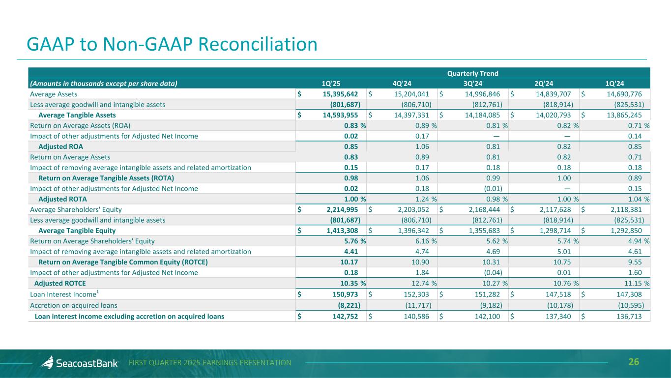 25FIRST QUARTER 2025 EARNINGS PRESENTATION Quarterly Trend (Amounts in thousands except per share data) 1Q'25 4Q'24 3Q'24 2Q'24 1Q'24 Adjusted Noninterest Expense $ 89,546 $ 85,295 $ 84,818 $ 82,537 $ 83,277 Provision for credit losses on unfunded commitments (150) (250) (250) (251) (250) Other real estate owned expense and net (loss) gain on sale (241) (84) (491) 109 26 Amortization of intangibles (5,309) (5,587) (6,002) (6,003) (6,292) Net Adjusted Noninterest Expense 83,846 79,374 78,075 76,392 76,761 Average tangible assets $ 14,593,955 $ 14,397,331 $ 14,184,085 $ 14,020,793 $ 13,865,245 Net Adjusted Noninterest Expense to Average Tangible Assets 2.33 % 2.19 % 2.19 % 2.19 % 2.23 % Net Revenue $ 140,697 $ 132,872 $ 130,344 $ 126,608 $ 125,575 Total Adjustments to Net Revenue (196) 8,388 (187) 44 (229) Impact of FTE adjustment 340 311 310 233 220 Adjusted Net Revenue on a FTE basis $ 140,841 $ 141,571 $ 130,467 $ 126,885 $ 125,566 Adjusted Efficiency Ratio 59.53 % 56.07 % 59.84 % 60.21 % 61.13 % Net Interest Income $ 118,517 $ 115,804 $ 106,665 $ 104,424 $ 105,078 Impact of FTE adjustment 340 311 310 233 220 Net Interest Income Including FTE adjustment 118,857 116,115 106,975 104,657 105,298 Total noninterest income 22,180 17,068 23,679 22,184 20,497 Total noninterest expense less provision for credit losses on unfunded commitments 90,447 85,325 84,568 82,286 90,121 Pre-Tax Pre-Provision Earnings 50,590 47,858 46,086 44,555 35,674 Total Adjustments to Noninterest Income (196) 8,388 (187) 44 (229) Total Adjustments to Noninterest Expense including other real estate owned expense and net (loss) gain on sale 1,292 364 491 (109) 7,068 Adjusted Pre-Tax Pre-Provision Earnings $ 51,686 $ 56,610 $ 46,390 $ 44,490 $ 42,513 GAAP to Non-GAAP Reconciliation