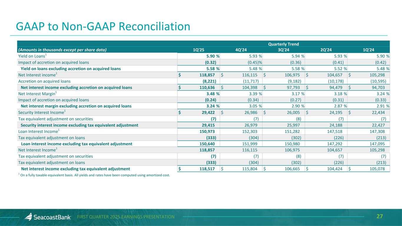 26FIRST QUARTER 2025 EARNINGS PRESENTATION Quarterly Trend (Amounts in thousands except per share data) 1Q'25 4Q'24 3Q'24 2Q'24 1Q'24 Average Assets $ 15,395,642 $ 15,204,041 $ 14,996,846 $ 14,839,707 $ 14,690,776 Less average goodwill and intangible assets (801,687) (806,710) (812,761) (818,914) (825,531) Average Tangible Assets $ 14,593,955 $ 14,397,331 $ 14,184,085 $ 14,020,793 $ 13,865,245 Return on Average Assets (ROA) 0.83 % 0.89 % 0.81 % 0.82 % 0.71 % Impact of other adjustments for Adjusted Net Income 0.02 0.17 — — 0.14 Adjusted ROA 0.85 1.06 0.81 0.82 0.85 Return on Average Assets 0.83 0.89 0.81 0.82 0.71 Impact of removing average intangible assets and related amortization 0.15 0.17 0.18 0.18 0.18 Return on Average Tangible Assets (ROTA) 0.98 1.06 0.99 1.00 0.89 Impact of other adjustments for Adjusted Net Income 0.02 0.18 (0.01) — 0.15 Adjusted ROTA 1.00 % 1.24 % 0.98 % 1.00 % 1.04 % Average Shareholders' Equity $ 2,214,995 $ 2,203,052 $ 2,168,444 $ 2,117,628 $ 2,118,381 Less average goodwill and intangible assets (801,687) (806,710) (812,761) (818,914) (825,531) Average Tangible Equity $ 1,413,308 $ 1,396,342 $ 1,355,683 $ 1,298,714 $ 1,292,850 Return on Average Shareholders' Equity 5.76 % 6.16 % 5.62 % 5.74 % 4.94 % Impact of removing average intangible assets and related amortization 4.41 4.74 4.69 5.01 4.61 Return on Average Tangible Common Equity (ROTCE) 10.17 10.90 10.31 10.75 9.55 Impact of other adjustments for Adjusted Net Income 0.18 1.84 (0.04) 0.01 1.60 Adjusted ROTCE 10.35 % 12.74 % 10.27 % 10.76 % 11.15 % Loan Interest Income1 $ 150,973 $ 152,303 $ 151,282 $ 147,518 $ 147,308 Accretion on acquired loans (8,221) (11,717) (9,182) (10,178) (10,595) Loan interest income excluding accretion on acquired loans $ 142,752 $ 140,586 $ 142,100 $ 137,340 $ 136,713 GAAP to Non-GAAP Reconciliation