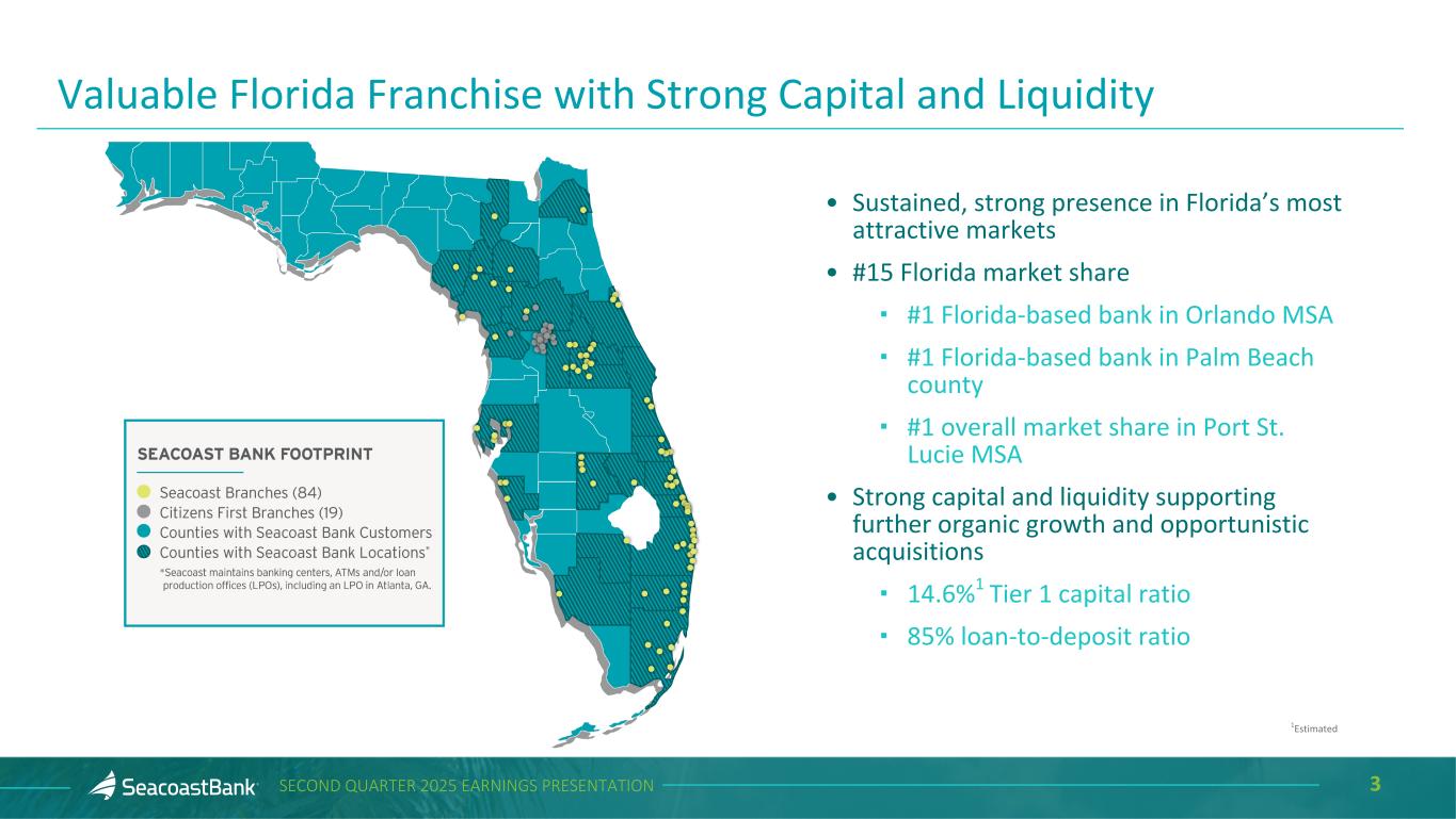 2SECOND QUARTER 2025 EARNINGS PRESENTATION Cautionary Notice Regarding Forward-Looking Statements This presentation contains “forward-looking statements” within the meaning, and protections, of Section 27A of the Securities Act of 1933, as amended, and Section 21E of the Securities Exchange Act of 1934, as amended, including, without limitation, statements about future financial and operating results, cost savings, enhanced revenues, economic and seasonal conditions in the Company’s markets, and improvements to reported earnings that may be realized from cost controls, tax law changes, new initiatives and for integration of banks that the Company has acquired, or expects to acquire, as well as statements with respect to Seacoast's objectives, strategic plans, expectations and intentions and other statements that are not historical facts. Actual results may differ from those set forth in the forward-looking statements. Forward-looking statements include statements with respect to the Company’s beliefs, plans, objectives, goals, expectations, anticipations, assumptions, estimates and intentions about future performance and involve known and unknown risks, uncertainties and other factors, which may be beyond the Company’s control, and which may cause the actual results, performance or achievements of Seacoast Banking Corporation of Florida (“Seacoast” or the “Company”) or its wholly-owned banking subsidiary, Seacoast National Bank (“Seacoast Bank”), to be materially different from results, performance or achievements expressed or implied by such forward-looking statements. You should not expect the Company to update any forward-looking statements. All statements other than statements of historical fact could be forward-looking statements. You can identify these forward- looking statements through the use of words such as "may", "will", "anticipate", "assume", "should", "support", "indicate", "would", "believe", "contemplate", "expect", "estimate", "continue", "further", "plan", "point to", "project", "could", "intend", "target" or other similar words and expressions of the future. These forward-looking statements may not be realized due to a variety of factors, including, without limitation: the impact of current and future economic and market conditions generally (including seasonality) and in the financial services industry, nationally and within Seacoast’s primary market areas, including the effects of inflationary pressures, changes in interest rates, tariffs or trade wars (including reduced consumer spending), slowdowns in economic growth, and the potential for high unemployment rates, as well as the financial stress on borrowers and changes to customer and client behavior and credit risk as a result of the foregoing; potential impacts of adverse developments in the banking industry, including those highlighted by high-profile bank failures, and including impacts on customer confidence, deposit outflows, liquidity and the regulatory response thereto (including increases in the cost of our deposit insurance assessments), the Company's ability to effectively manage its liquidity risk and any growth plans, and the availability of capital and funding; governmental monetary and fiscal policies, including interest rate policies of the Board of Governors of the Federal Reserve, as well as legislative, tax and regulatory changes including overdraft and late fee caps (if implemented), including those that impact the money supply and inflation; the risks of changes in interest rates on the level and composition of deposits (as well as the cost of, and competition for, deposits), loan demand, liquidity and the values of loan collateral, securities, and interest rate sensitive assets and liabilities; interest rate risks (including the impacts of interest rates on macroeconomic conditions, customer and client behavior, and on our net interest income), sensitivities and the shape of the yield curve; changes in accounting policies, rules and practices; changes in retail distribution strategies, customer preferences and behavior generally and as a result of economic factors, including heightened or persistent inflation; changes in the availability and cost of credit and capital in the financial markets; changes in the prices, values and sales volumes of residential and commercial real estate, especially as they relate to the value of collateral supporting the Company’s loans; the Company’s concentration in commercial real estate loans and in real estate collateral in Florida; Seacoast’s ability to comply with any regulatory requirements; and the risk that the regulatory environment may not be conducive to or may prohibit or delay the consummation of future mergers and/or business combinations, may increase the length of time and amount of resources required to consummate such transactions, and may reduce the anticipated benefit; inaccuracies or other failures from the use of models, including the failure of assumptions and estimates, as well as differences in, and changes to, economic, market and credit conditions; the impact on the valuation of Seacoast’s investments due to market volatility or counterparty payment risk, as well as the effect of a decline in stock market prices on our fee income from our wealth management business; statutory and regulatory dividend restrictions; increases in regulatory capital requirements for banking organizations generally; the risks of mergers, acquisitions and divestitures, including Seacoast’s ability to continue to identify acquisition targets, successfully acquire and integrate desirable financial institutions and realize expected revenues and revenue synergies; changes in technology or products that may be more difficult, costly, or less effective than anticipated; the Company’s ability to identify and address increased cybersecurity risks, including those impacting vendors and other third parties which may be exacerbated b