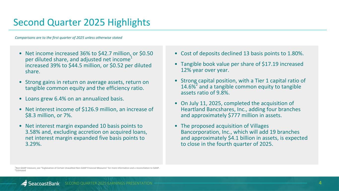 3SECOND QUARTER 2025 EARNINGS PRESENTATION • Sustained, strong presence in Florida’s most attractive markets • #15 Florida market share ▪ #1 Florida-based bank in Orlando MSA ▪ #1 Florida-based bank in Palm Beach county ▪ #1 overall market share in Port St. Lucie MSA • Strong capital and liquidity supporting further organic growth and opportunistic acquisitions ▪ 14.6%1 Tier 1 capital ratio ▪ 85% loan-to-deposit ratio Valuable Florida Franchise with Strong Capital and Liquidity 1Estimated