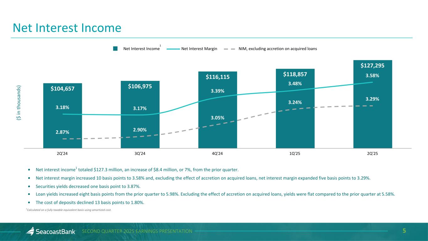 4SECOND QUARTER 2025 EARNINGS PRESENTATION • Net income increased 36% to $42.7 million, or $0.50 per diluted share, and adjusted net income1 increased 39% to $44.5 million, or $0.52 per diluted share. • Strong gains in return on average assets, return on tangible common equity and the efficiency ratio. • Loans grew 6.4% on an annualized basis. • Net interest income of $126.9 million, an increase of $8.3 million, or 7%. • Net interest margin expanded 10 basis points to 3.58% and, excluding accretion on acquired loans, net interest margin expanded five basis points to 3.29%. Second Quarter 2025 Highlights Comparisons are to the first quarter of 2025 unless otherwise stated • Cost of deposits declined 13 basis points to 1.80%. • Tangible book value per share of $17.19 increased 12% year over year. • Strong capital position, with a Tier 1 capital ratio of 14.6%2 and a tangible common equity to tangible assets ratio of 9.8%. • On July 11, 2025, completed the acquisition of Heartland Bancshares, Inc., adding four branches and approximately $777 million in assets. • The proposed acquisition of Villages Bancorporation, Inc., which will add 19 branches and approximately $4.1 billion in assets, is expected to close in the fourth quarter of 2025. 1Non-GAAP measure, see “Explanation of Certain Unaudited Non-GAAP Financial Measures" for more information and a reconciliation to GAAP. 2Estimated