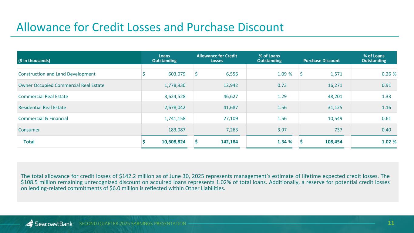 10SECOND QUARTER 2025 EARNINGS PRESENTATION At June 30, 2025 Loan Portfolio Mix Seacoast's lending strategy results in a diverse and granular loan portfolio. Seacoast’s average loan size is $437 thousand and the average commercial loan size is $872 thousand. Portfolio diversification in terms of asset mix, industry, and loan type has been a critical element of the Company’s lending strategy. Exposures across industries and collateral types are broadly distributed. Construction and land development and commercial real estate loans, as defined in regulatory guidance, represent 33% and 221%, respectively, of total consolidated risk-based capital1. CRE-Retail, 12% CRE-Office, 5% CRE-Multifamily 5+, 4% CRE-Hotel/Motel, 3% CRE-Industrial/Warehouse, 5% CRE-Other, 5% OOCRE, 17% Construction & Land Development, 6% Commercial & Financial, 16% Residential, 25% Consumer, 2% 1Estimated