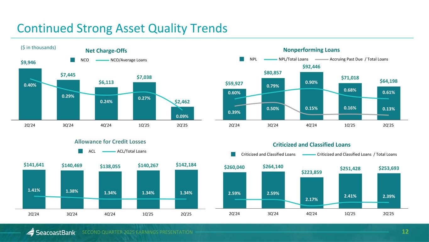 11SECOND QUARTER 2025 EARNINGS PRESENTATION Allowance for Credit Losses and Purchase Discount ($ in thousands) Loans Outstanding Allowance for Credit Losses % of Loans Outstanding Purchase Discount % of Loans Outstanding Construction and Land Development $ 603,079 $ 6,556 1.09 % $ 1,571 0.26 % Owner Occupied Commercial Real Estate 1,778,930 12,942 0.73 16,271 0.91 Commercial Real Estate 3,624,528 46,627 1.29 48,201 1.33 Residential Real Estate 2,678,042 41,687 1.56 31,125 1.16 Commercial & Financial 1,741,158 27,109 1.56 10,549 0.61 Consumer 183,087 7,263 3.97 737 0.40 Total $ 10,608,824 $ 142,184 1.34 % $ 108,454 1.02 % The total allowance for credit losses of $142.2 million as of June 30, 2025 represents management’s estimate of lifetime expected credit losses. The $108.5 million remaining unrecognized discount on acquired loans represents 1.02% of total loans. Additionally, a reserve for potential credit losses on lending-related commitments of $6.0 million is reflected within Other Liabilities.