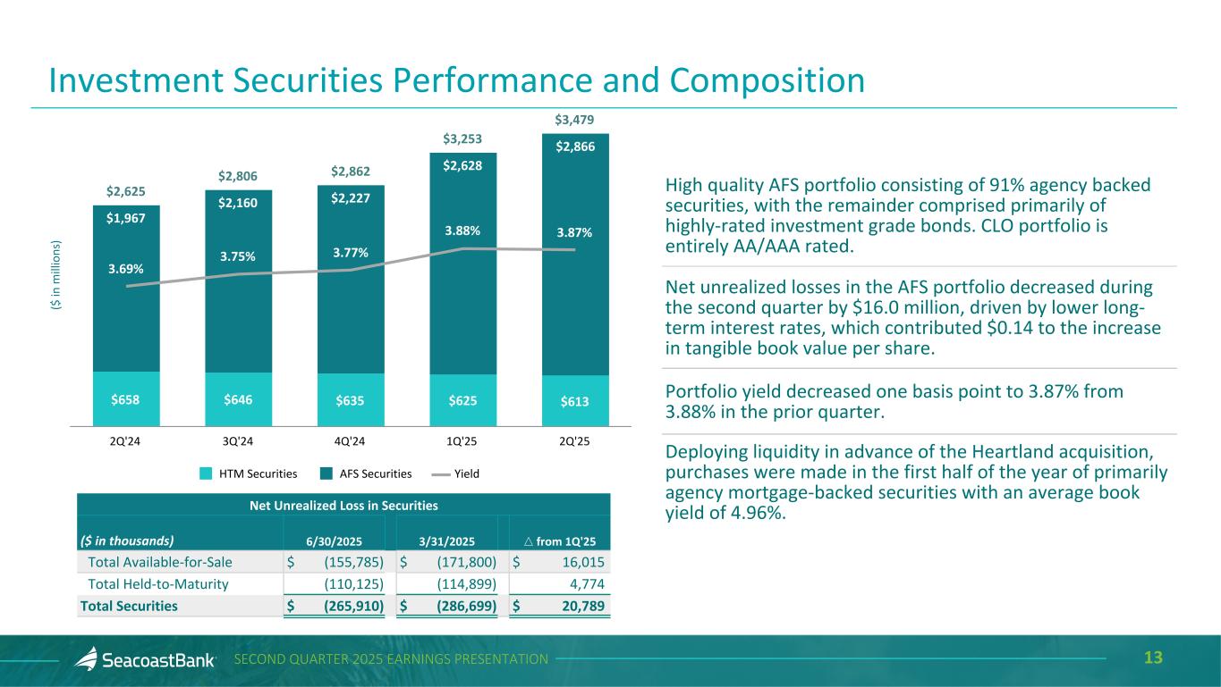 12SECOND QUARTER 2025 EARNINGS PRESENTATION Net Charge-Offs $7,445 $6,113 $7,038 $2,462 0.40% 0.29% 0.24% 0.27% 0.09% NCO NCO/Average Loans 2Q'24 3Q'24 4Q'24 1Q'25 2Q'25 ($ in thousands) Allowance for Credit Losses $141,641 $140,469 $138,055 $140,267 $142,184 1.41% 1.38% 1.34% 1.34% 1.34% ACL ACL/Total Loans 2Q'24 3Q'24 4Q'24 1Q'25 2Q'25 Continued Strong Asset Quality Trends Nonperforming Loans $59,927 $80,857 $92,446 $71,018 $64,198 0.60% 0.79% 0.90% 0.68% 0.61% 0.39% 0.50% 0.15% 0.16% 0.13% NPL NPL/Total Loans Accruing Past Due / Total Loans 2Q'24 3Q'24 4Q'24 1Q'25 2Q'25 Criticized and Classified Loans $260,040 $264,140 $223,859 $251,428 $253,693 2.59% 2.59% 2.17% 2.41% 2.39% Criticized and Classified Loans Criticized and Classified Loans / Total Loans 2Q'24 3Q'24 4Q'24 1Q'25 2Q'25 $9,946