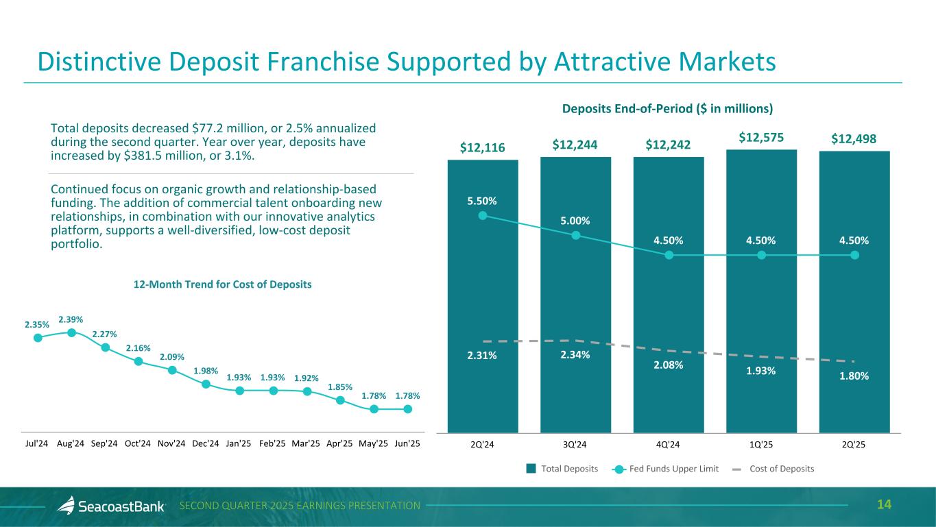 13SECOND QUARTER 2025 EARNINGS PRESENTATION Investment Securities Performance and Composition High quality AFS portfolio consisting of 91% agency backed securities, with the remainder comprised primarily of highly-rated investment grade bonds. CLO portfolio is entirely AA/AAA rated. Net unrealized losses in the AFS portfolio decreased during the second quarter by $16.0 million, driven by lower long- term interest rates, which contributed $0.14 to the increase in tangible book value per share. Portfolio yield decreased one basis point to 3.87% from 3.88% in the prior quarter. Deploying liquidity in advance of the Heartland acquisition, purchases were made in the first half of the year of primarily agency mortgage-backed securities with an average book yield of 4.96%. Net Unrealized Loss in Securities ($ in thousands) 6/30/2025 3/31/2025 △ from 1Q'25 Total Available-for-Sale $ (155,785) $ (171,800) $ 16,015 Total Held-to-Maturity (110,125) (114,899) 4,774 Total Securities $ (265,910) $ (286,699) $ 20,789 ($ in m ill io ns ) $2,625 $2,806 $2,862 $3,253 $3,479 $658 $646 $635 $625 $613 $1,967 $2,160 $2,227 $2,628 $2,866 3.69% 3.75% 3.77% 3.88% 3.87% HTM Securities AFS Securities Yield 2Q'24 3Q'24 4Q'24 1Q'25 2Q'25