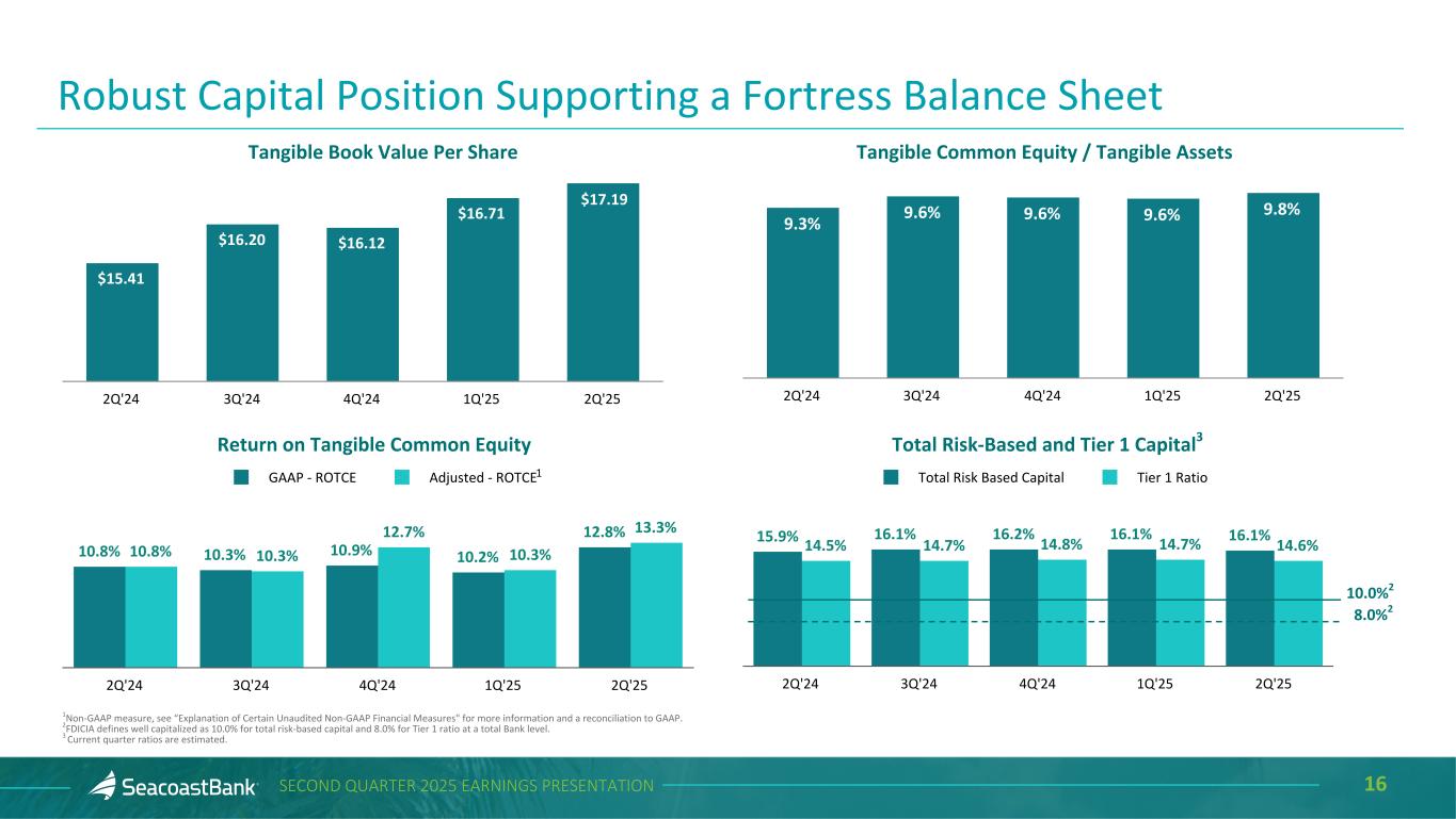 15SECOND QUARTER 2025 EARNINGS PRESENTATION Deposits End-of-Period ($ in millions) $12,116 $12,244 $12,242 $12,575 $12,498 Transaction Accounts Savings Money Market Brokered Time Deposits 2Q'24 3Q'24 4Q'24 1Q'25 2Q'25 Granular, Diverse and Relationship-Focused Customer Funding Base The Company benefits from a granular deposit franchise, with the top ten depositors representing approximately 3% of total deposits. Customer transaction account balances represent 47% of total deposits. Consumer deposits represent 40% of total deposits, with an average balance per account of $25 thousand. Business deposits represent 60% of total deposits, with an average balance per account of $113 thousand. The average tenure for a Seacoast customer is 10.5 years. 47%50%50%49%50% 4%4%4%4%5% 30% 33% 33% 33% 33% 3% 2% 2% 2% 4% 12% 12% 11% 11% 11%