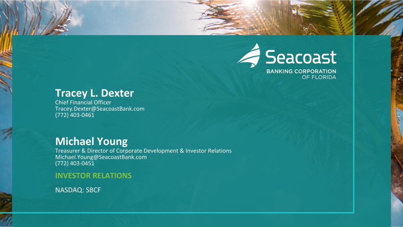 Tracey L. Dexter Chief Financial Officer Tracey.Dexter@SeacoastBank.com (772) 403-0461 Michael Young Treasurer & Director of Corporate Development & Investor Relations Michael.Young@SeacoastBank.com (772) 403-0451 INVESTOR RELATIONS NASDAQ: SBCF