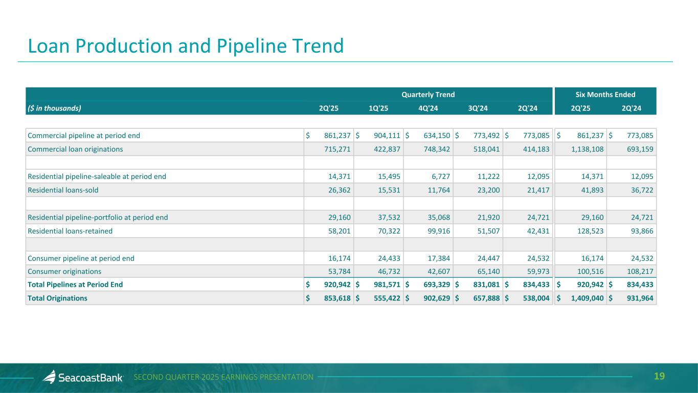 19SECOND QUARTER 2025 EARNINGS PRESENTATION Quarterly Trend Six Months Ended ($ in thousands) 2Q'25 1Q'25 4Q'24 3Q'24 2Q'24 2Q'25 2Q'24 Commercial pipeline at period end $ 861,237 $ 904,111 $ 634,150 $ 773,492 $ 773,085 $ 861,237 $ 773,085 Commercial loan originations 715,271 422,837 748,342 518,041 414,183 1,138,108 693,159 Residential pipeline-saleable at period end 14,371 15,495 6,727 11,222 12,095 14,371 12,095 Residential loans-sold 26,362 15,531 11,764 23,200 21,417 41,893 36,722 Residential pipeline-portfolio at period end 29,160 37,532 35,068 21,920 24,721 29,160 24,721 Residential loans-retained 58,201 70,322 99,916 51,507 42,431 128,523 93,866 Consumer pipeline at period end 16,174 24,433 17,384 24,447 24,532 16,174 24,532 Consumer originations 53,784 46,732 42,607 65,140 59,973 100,516 108,217 Total Pipelines at Period End $ 920,942 $ 981,571 $ 693,329 $ 831,081 $ 834,433 $ 920,942 $ 834,433 Total Originations $ 853,618 $ 555,422 $ 902,629 $ 657,888 $ 538,004 $ 1,409,040 $ 931,964 Loan Production and Pipeline Trend