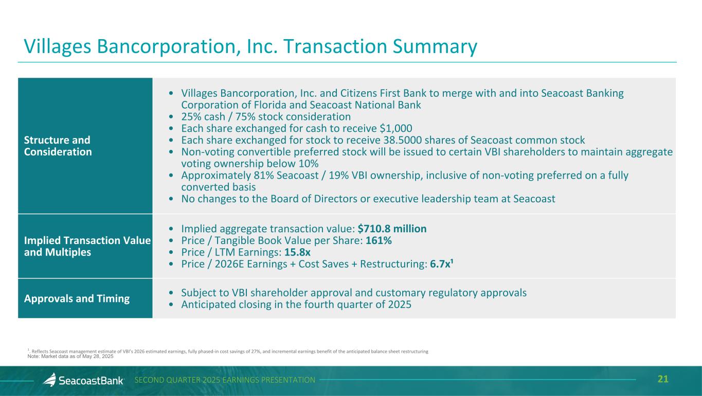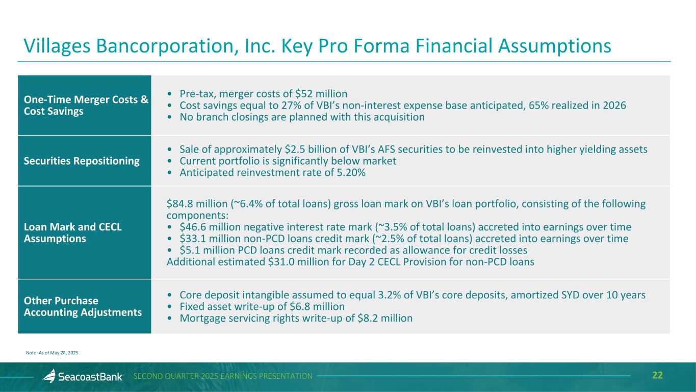 21SECOND QUARTER 2025 EARNINGS PRESENTATION Villages Bancorporation, Inc. Transaction Summary Structure and Consideration • Villages Bancorporation, Inc. and Citizens First Bank to merge with and into Seacoast Banking Corporation of Florida and Seacoast National Bank • 25% cash / 75% stock consideration • Each share exchanged for cash to receive $1,000 • Each share exchanged for stock to receive 38.5000 shares of Seacoast common stock • Non-voting convertible preferred stock will be issued to certain VBI shareholders to maintain aggregate voting ownership below 10% • Approximately 81% Seacoast / 19% VBI ownership, inclusive of non-voting preferred on a fully converted basis • No changes to the Board of Directors or executive leadership team at Seacoast Implied Transaction Value and Multiples • Implied aggregate transaction value: $710.8 million • Price / Tangible Book Value per Share: 161% • Price / LTM Earnings: 15.8x • Price / 2026E Earnings + Cost Saves + Restructuring: 6.7x¹ Approvals and Timing • Subject to VBI shareholder approval and customary regulatory approvals • Anticipated closing in the fourth quarter of 2025 1. Reflects Seacoast management estimate of VBI’s 2026 estimated earnings, fully phased-in cost savings of 27%, and incremental earnings benefit of the anticipated balance sheet restructuring Note: Market data as of May 28, 2025