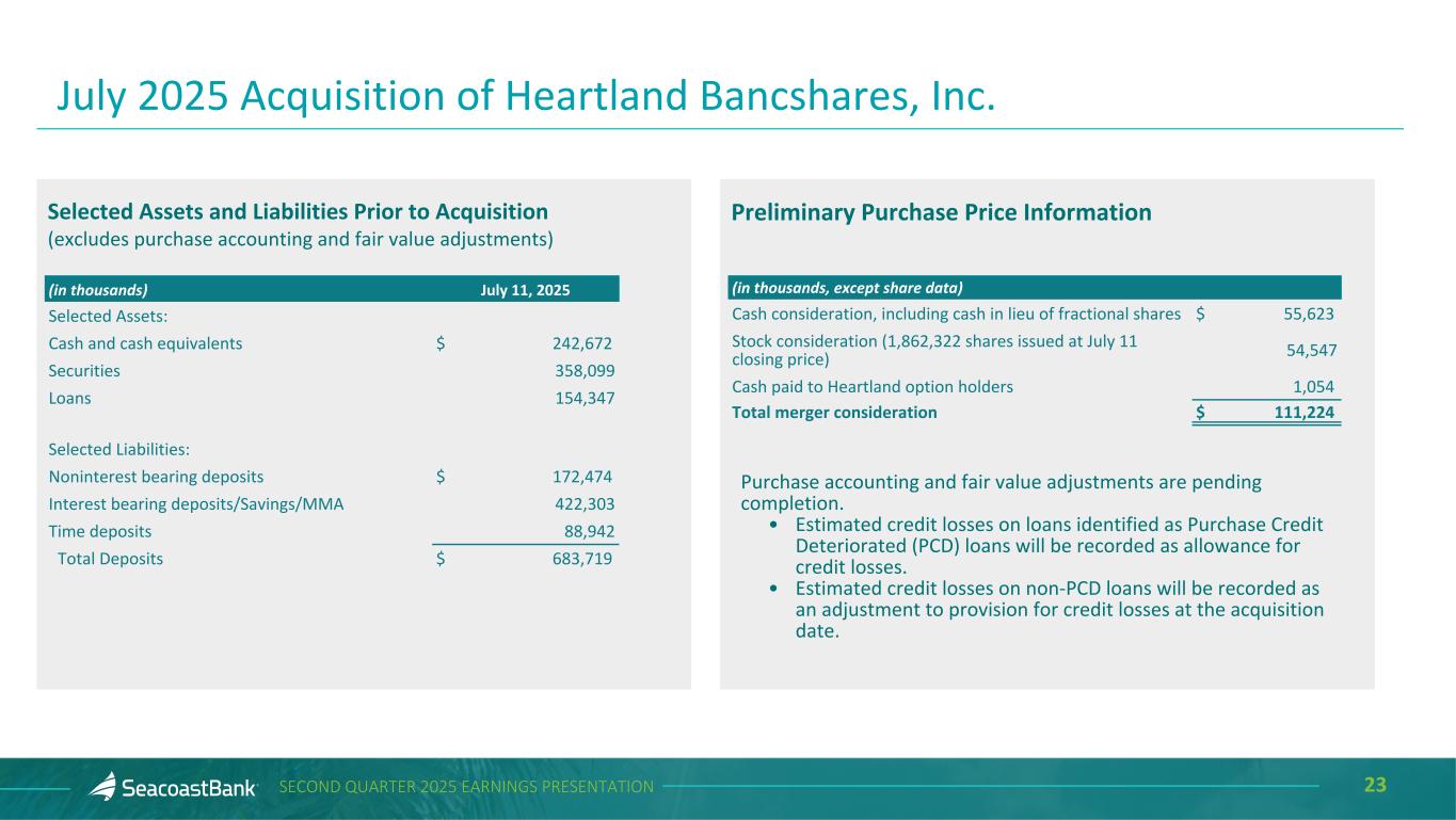 22SECOND QUARTER 2025 EARNINGS PRESENTATION Villages Bancorporation, Inc. Key Pro Forma Financial Assumptions One-Time Merger Costs & Cost Savings • Pre-tax, merger costs of $52 million • Cost savings equal to 27% of VBI’s non-interest expense base anticipated, 65% realized in 2026 • No branch closings are planned with this acquisition Securities Repositioning • Sale of approximately $2.5 billion of VBI’s AFS securities to be reinvested into higher yielding assets • Current portfolio is significantly below market • Anticipated reinvestment rate of 5.20% Loan Mark and CECL Assumptions $84.8 million (~6.4% of total loans) gross loan mark on VBI’s loan portfolio, consisting of the following components: • $46.6 million negative interest rate mark (~3.5% of total loans) accreted into earnings over time • $33.1 million non-PCD loans credit mark (~2.5% of total loans) accreted into earnings over time • $5.1 million PCD loans credit mark recorded as allowance for credit losses Additional estimated $31.0 million for Day 2 CECL Provision for non-PCD loans Other Purchase Accounting Adjustments • Core deposit intangible assumed to equal 3.2% of VBI’s core deposits, amortized SYD over 10 years • Fixed asset write-up of $6.8 million • Mortgage servicing rights write-up of $8.2 million Note: As of May 28, 2025