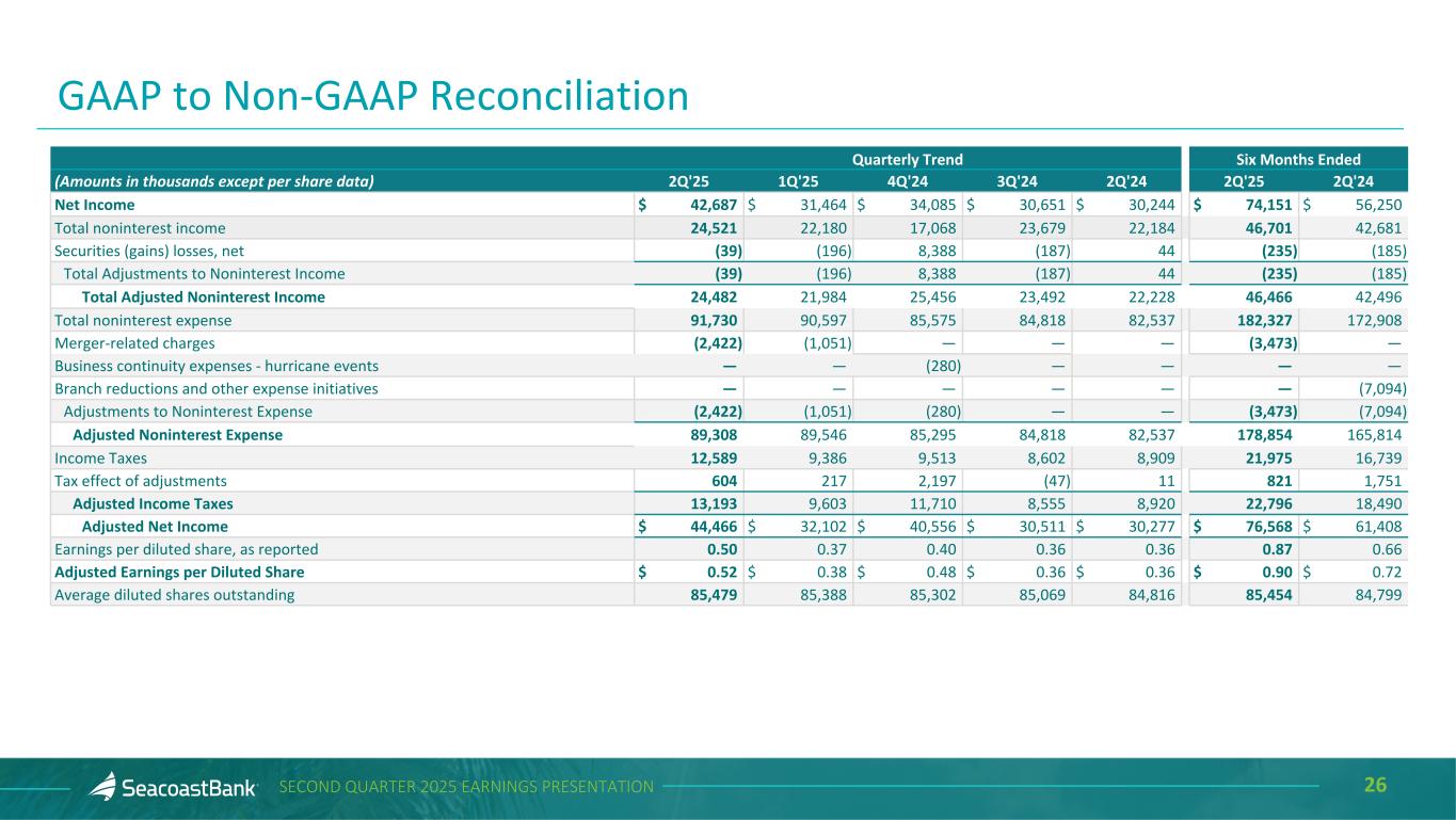 25SECOND QUARTER 2025 EARNINGS PRESENTATION This presentation contains financial information determined by methods other than Generally Accepted Accounting Principles (“GAAP”). The financial highlights provide reconciliations between GAAP and adjusted financial measures including net income, noninterest income, noninterest expense, tax adjustments and other financial ratios. Management uses these non-GAAP financial measures in its analysis of the Company’s performance and believes these presentations provide useful supplemental information, and a clearer understanding of the Company’s performance. The Company believes the non-GAAP measures enhance investors’ understanding of the Company’s business and performance and if not provided would be requested by the investor community. These measures are also useful in understanding performance trends and facilitate comparisons with the performance of other financial institutions. The limitations associated with operating measures are the risk that persons might disagree as to the appropriateness of items comprising these measures and that different companies might define or calculate these measures differently. The Company provides reconciliations between GAAP and these non-GAAP measures. These disclosures should not be considered an alternative to GAAP. Explanation of Certain Unaudited Non-GAAP Financial Measures