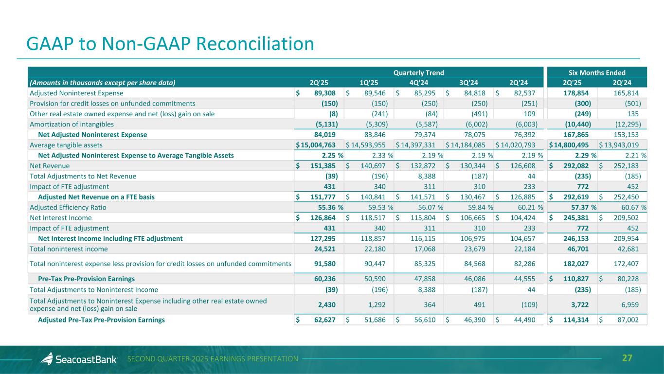 26SECOND QUARTER 2025 EARNINGS PRESENTATION Quarterly Trend Six Months Ended (Amounts in thousands except per share data) 2Q'25 1Q'25 4Q'24 3Q'24 2Q'24 2Q'25 2Q'24 Net Income $ 42,687 $ 31,464 $ 34,085 $ 30,651 $ 30,244 $ 74,151 $ 56,250 Total noninterest income 24,521 22,180 17,068 23,679 22,184 46,701 42,681 Securities (gains) losses, net (39) (196) 8,388 (187) 44 (235) (185) Total Adjustments to Noninterest Income (39) (196) 8,388 (187) 44 (235) (185) Total Adjusted Noninterest Income 24,482 21,984 25,456 23,492 22,228 46,466 42,496 Total noninterest expense 91,730 90,597 85,575 84,818 82,537 182,327 172,908 Merger-related charges (2,422) (1,051) — — — (3,473) — Business continuity expenses - hurricane events — — (280) — — — — Branch reductions and other expense initiatives — — — — — — (7,094) Adjustments to Noninterest Expense (2,422) (1,051) (280) — — (3,473) (7,094) Adjusted Noninterest Expense 89,308 89,546 85,295 84,818 82,537 178,854 165,814 Income Taxes 12,589 9,386 9,513 8,602 8,909 21,975 16,739 Tax effect of adjustments 604 217 2,197 (47) 11 821 1,751 Adjusted Income Taxes 13,193 9,603 11,710 8,555 8,920 22,796 18,490 Adjusted Net Income $ 44,466 $ 32,102 $ 40,556 $ 30,511 $ 30,277 $ 76,568 $ 61,408 Earnings per diluted share, as reported 0.50 0.37 0.40 0.36 0.36 0.87 0.66 Adjusted Earnings per Diluted Share $ 0.52 $ 0.38 $ 0.48 $ 0.36 $ 0.36 $ 0.90 $ 0.72 Average diluted shares outstanding 85,479 85,388 85,302 85,069 84,816 85,454 84,799 GAAP to Non-GAAP Reconciliation