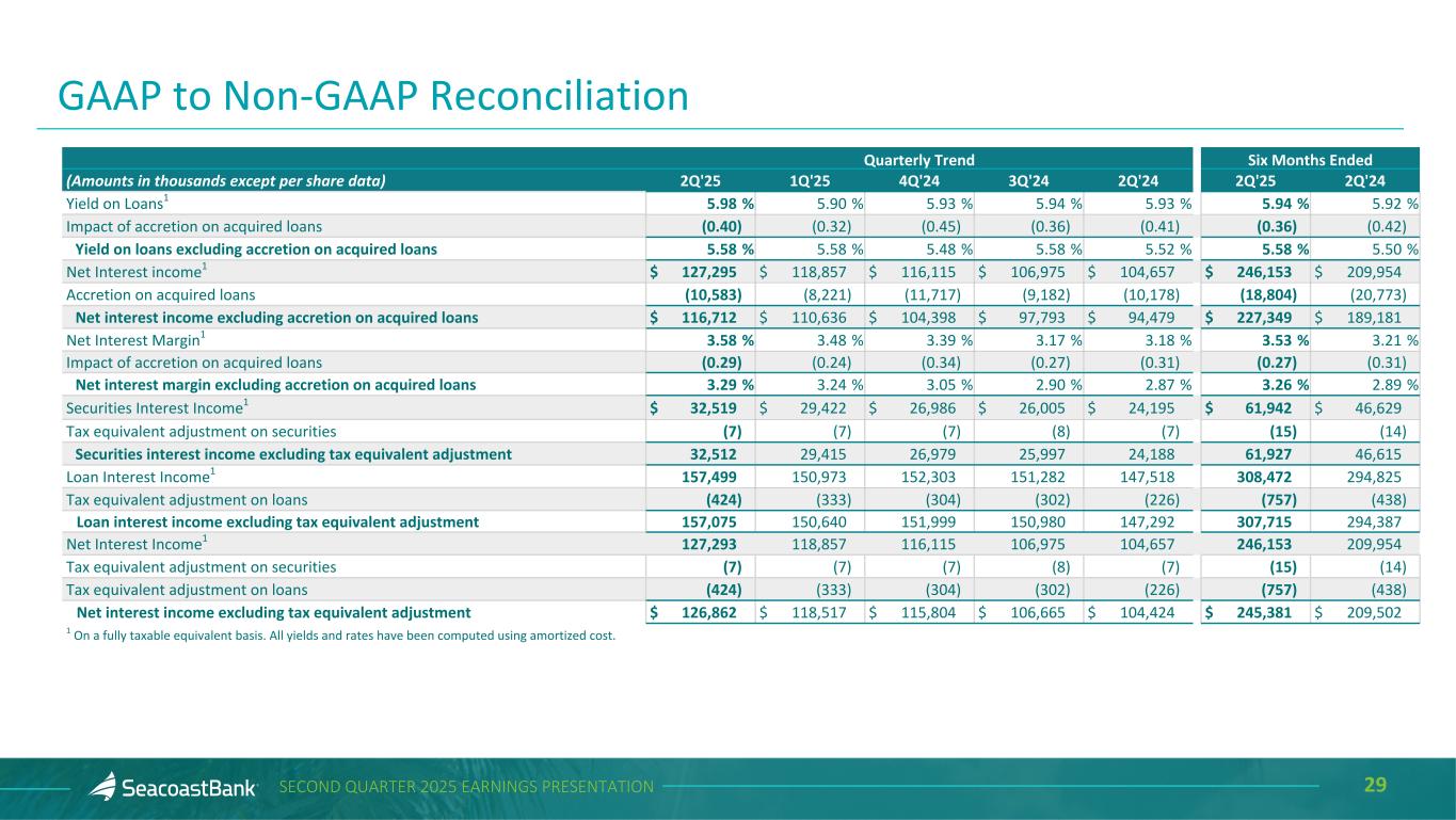 29SECOND QUARTER 2025 EARNINGS PRESENTATION Quarterly Trend Six Months Ended (Amounts in thousands except per share data) 2Q'25 1Q'25 4Q'24 3Q'24 2Q'24 2Q'25 2Q'24 Yield on Loans1 5.98 % 5.90 % 5.93 % 5.94 % 5.93 % 5.94 % 5.92 % Impact of accretion on acquired loans (0.40) (0.32) (0.45) (0.36) (0.41) (0.36) (0.42) Yield on loans excluding accretion on acquired loans 5.58 % 5.58 % 5.48 % 5.58 % 5.52 % 5.58 % 5.50 % Net Interest income1 $ 127,295 $ 118,857 $ 116,115 $ 106,975 $ 104,657 $ 246,153 $ 209,954 Accretion on acquired loans (10,583) (8,221) (11,717) (9,182) (10,178) (18,804) (20,773) Net interest income excluding accretion on acquired loans $ 116,712 $ 110,636 $ 104,398 $ 97,793 $ 94,479 $ 227,349 $ 189,181 Net Interest Margin1 3.58 % 3.48 % 3.39 % 3.17 % 3.18 % 3.53 % 3.21 % Impact of accretion on acquired loans (0.29) (0.24) (0.34) (0.27) (0.31) (0.27) (0.31) Net interest margin excluding accretion on acquired loans 3.29 % 3.24 % 3.05 % 2.90 % 2.87 % 3.26 % 2.89 % Securities Interest Income1 $ 32,519 $ 29,422 $ 26,986 $ 26,005 $ 24,195 $ 61,942 $ 46,629 Tax equivalent adjustment on securities (7) (7) (7) (8) (7) (15) (14) Securities interest income excluding tax equivalent adjustment 32,512 29,415 26,979 25,997 24,188 61,927 46,615 Loan Interest Income1 157,499 150,973 152,303 151,282 147,518 308,472 294,825 Tax equivalent adjustment on loans (424) (333) (304) (302) (226) (757) (438) Loan interest income excluding tax equivalent adjustment 157,075 150,640 151,999 150,980 147,292 307,715 294,387 Net Interest Income1 127,293 118,857 116,115 106,975 104,657 246,153 209,954 Tax equivalent adjustment on securities (7) (7) (7) (8) (7) (15) (14) Tax equivalent adjustment on loans (424) (333) (304) (302) (226) (757) (438) Net interest income excluding tax equivalent adjustment $ 126,862 $ 118,517 $ 115,804 $ 106,665 $ 104,424 $ 245,381 $ 209,502 1 On a fully taxable equivalent basis. All yields and rates have been computed using amortized cost. GAAP to Non-GAAP Reconciliation