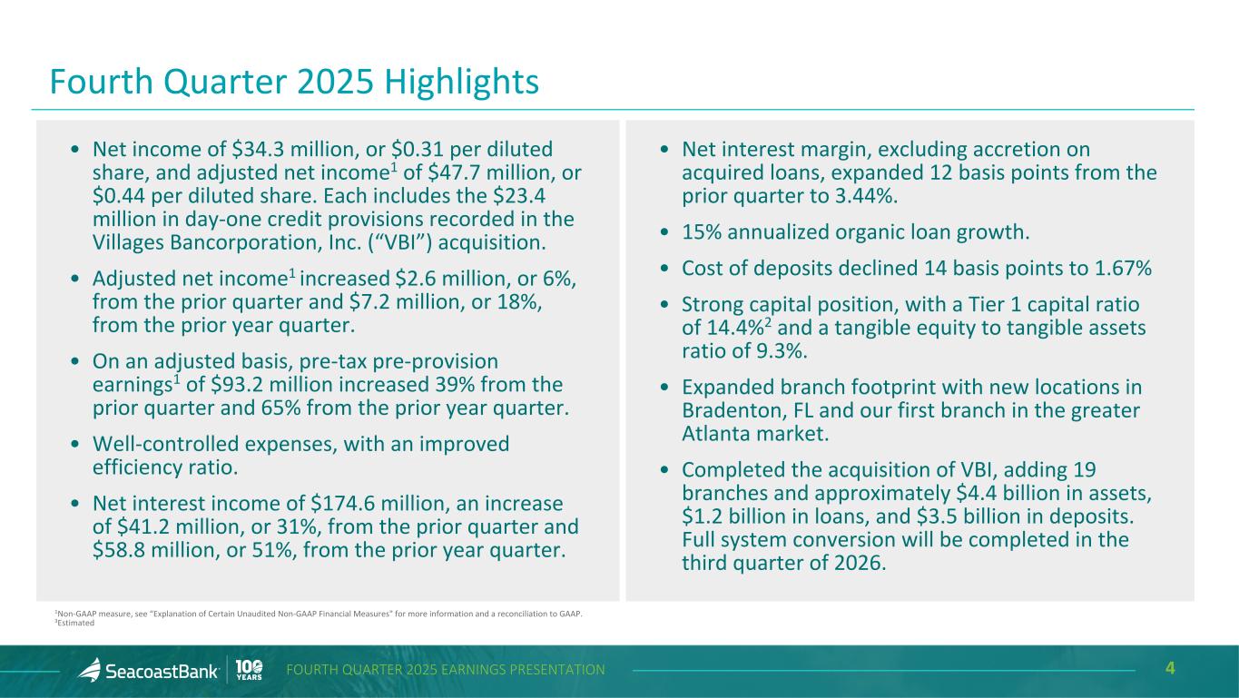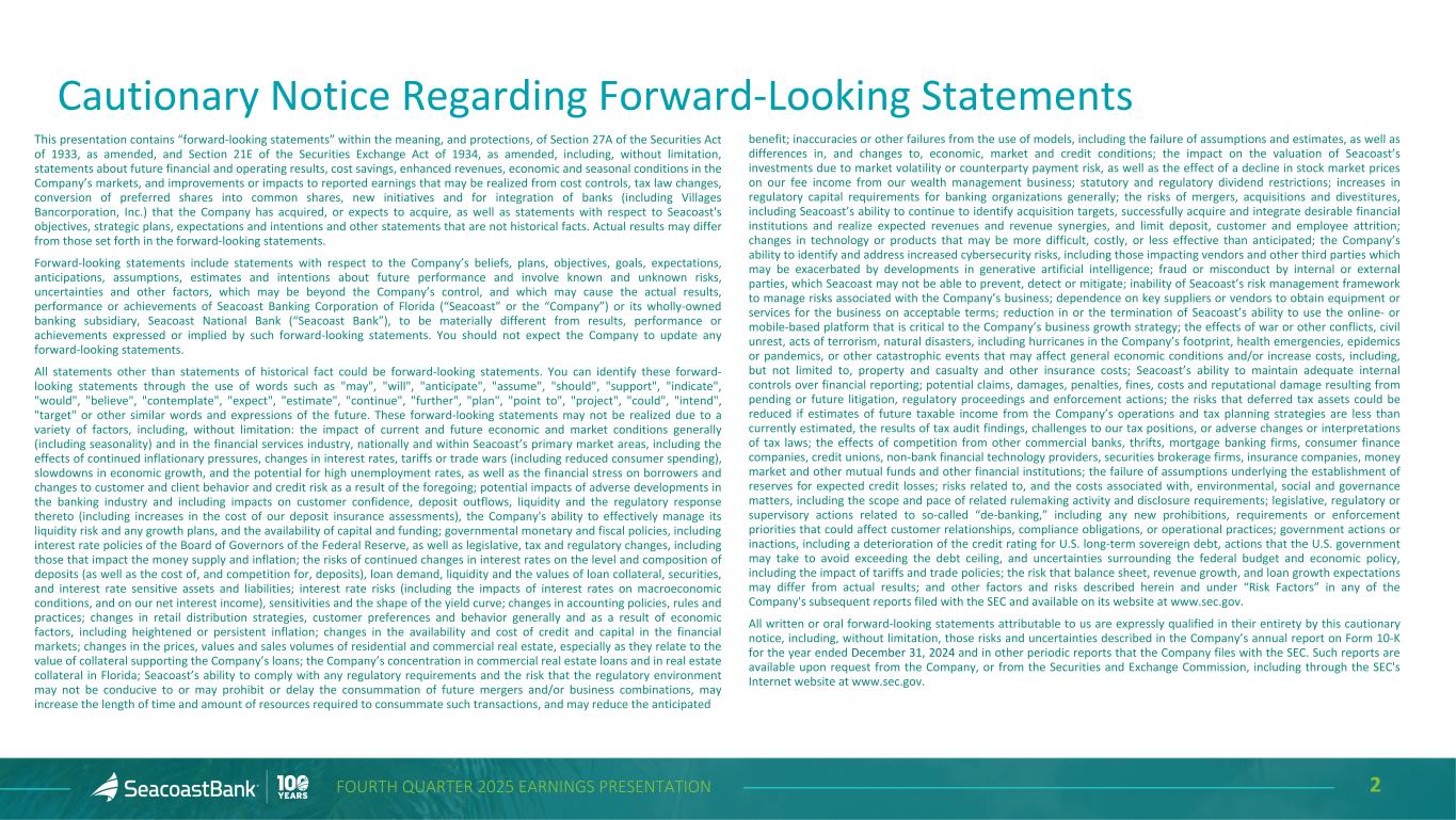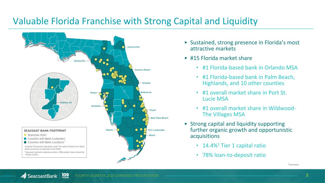 2FOURTH QUARTER 2025 EARNINGS PRESENTATION Cautionary Notice Regarding Forward-Looking Statements This presentation contains “forward-looking statements” within the meaning, and protections, of Section 27A of the Securities Act of 1933, as amended, and Section 21E of the Securities Exchange Act of 1934, as amended, including, without limitation, statements about future financial and operating results, cost savings, enhanced revenues, economic and seasonal conditions in the Company’s markets, and improvements or impacts to reported earnings that may be realized from cost controls, tax law changes, conversion of preferred shares into common shares, new initiatives and for integration of banks (including Villages Bancorporation, Inc.) that the Company has acquired, or expects to acquire, as well as statements with respect to Seacoast's objectives, strategic plans, expectations and intentions and other statements that are not historical facts. Actual results may differ from those set forth in the forward-looking statements. Forward-looking statements include statements with respect to the Company’s beliefs, plans, objectives, goals, expectations, anticipations, assumptions, estimates and intentions about future performance and involve known and unknown risks, uncertainties and other factors, which may be beyond the Company’s control, and which may cause the actual results, performance or achievements of Seacoast Banking Corporation of Florida (“Seacoast” or the “Company”) or its wholly-owned banking subsidiary, Seacoast National Bank (“Seacoast Bank”), to be materially different from results, performance or achievements expressed or implied by such forward-looking statements. You should not expect the Company to update any forward-looking statements. All statements other than statements of historical fact could be forward-looking statements. You can identify these forward- looking statements through the use of words such as "may", "will", "anticipate", "assume", "should", "support", "indicate", "would", "believe", "contemplate", "expect", "estimate", "continue", "further", "plan", "point to", "project", "could", "intend", "target" or other similar words and expressions of the future. These forward-looking statements may not be realized due to a variety of factors, including, without limitation: the impact of current and future economic and market conditions generally (including seasonality) and in the financial services industry, nationally and within Seacoast’s primary market areas, including the effects of continued inflationary pressures, changes in interest rates, tariffs or trade wars (including reduced consumer spending), slowdowns in economic growth, and the potential for high unemployment rates, as well as the financial stress on borrowers and changes to customer and client behavior and credit risk as a result of the foregoing; potential impacts of adverse developments in the banking industry and including impacts on customer confidence, deposit outflows, liquidity and the regulatory response thereto (including increases in the cost of our deposit insurance assessments), the Company's ability to effectively manage its liquidity risk and any growth plans, and the availability of capital and funding; governmental monetary and fiscal policies, including interest rate policies of the Board of Governors of the Federal Reserve, as well as legislative, tax and regulatory changes, including those that impact the money supply and inflation; the risks of continued changes in interest rates on the level and composition of deposits (as well as the cost of, and competition for, deposits), loan demand, liquidity and the values of loan collateral, securities, and interest rate sensitive assets and liabilities; interest rate risks (including the impacts of interest rates on macroeconomic conditions, and on our net interest income), sensitivities and the shape of the yield curve; changes in accounting policies, rules and practices; changes in retail distribution strategies, customer preferences and behavior generally and as a result of economic factors, including heightened or persistent inflation; changes in the availability and cost of credit and capital in the financial markets; changes in the prices, values and sales volumes of residential and commercial real estate, especially as they relate to the value of collateral supporting the Company’s loans; the Company’s concentration in commercial real estate loans and in real estate collateral in Florida; Seacoast’s ability to comply with any regulatory requirements and the risk that the regulatory environment may not be conducive to or may prohibit or delay the consummation of future mergers and/or business combinations, may increase the length of time and amount of resources required to consummate such transactions, and may reduce the anticipated benefit; inaccuracies or other failures from the use of models, including the failure of assumptions and estimates, as well as differences in, and changes to, economic, market and credit conditions; the impact on the valuation of Seacoast’s investments due to market volatility or counterparty payment risk, as well as the effect of a decline in stock market prices on our fee income from our wealth management business; statutory and regulatory dividend restrictions; increases in regulatory capital requirements for banking organizations generally; the risks of mergers, acquisitions and divestitures, including Seacoast’s ability to continue to identify acquisition targets, successfully acquire and integrate desirable financial institutions and realize expected revenues and revenue synergies, and limit deposit, customer and employee attrition; changes in technology or products that may be more difficult, costly, or less effective than anticipated; the Company’s ability to identify and address increased cybersecurity risks, including those impacting vendors and other third part