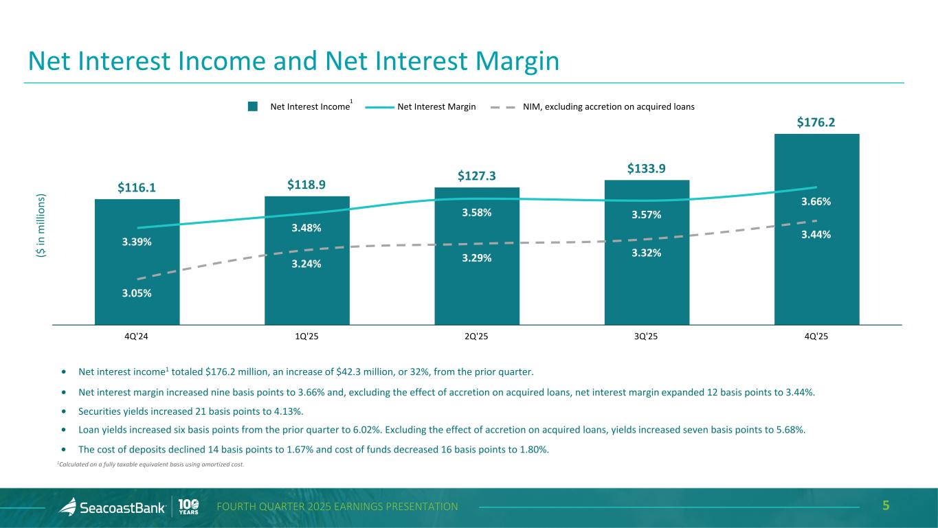 4FOURTH QUARTER 2025 EARNINGS PRESENTATION • Net income of $34.3 million, or $0.31 per diluted share, and adjusted net income1 of $47.7 million, or $0.44 per diluted share. Each includes the $23.4 million in day-one credit provisions recorded in the Villages Bancorporation, Inc. (“VBI”) acquisition. • Adjusted net income1 increased $2.6 million, or 6%, from the prior quarter and $7.2 million, or 18%, from the prior year quarter. • On an adjusted basis, pre-tax pre-provision earnings1 of $93.2 million increased 39% from the prior quarter and 65% from the prior year quarter. • Well-controlled expenses, with an improved efficiency ratio. • Net interest income of $174.6 million, an increase of $41.2 million, or 31%, from the prior quarter and $58.8 million, or 51%, from the prior year quarter. Fourth Quarter 2025 Highlights • Net interest margin, excluding accretion on acquired loans, expanded 12 basis points from the prior quarter to 3.44%. • 15% annualized organic loan growth. • Cost of deposits declined 14 basis points to 1.67% • Strong capital position, with a Tier 1 capital ratio of 14.4%2 and a tangible equity to tangible assets ratio of 9.3%. • Expanded branch footprint with new locations in Bradenton, FL and our first branch in the greater Atlanta market. • Completed the acquisition of VBI, adding 19 branches and approximately $4.4 billion in assets, $1.2 billion in loans, and $3.5 billion in deposits. Full system conversion will be completed in the third quarter of 2026. 1Non-GAAP measure, see “Explanation of Certain Unaudited Non-GAAP Financial Measures" for more information and a reconciliation to GAAP. 3Estimated