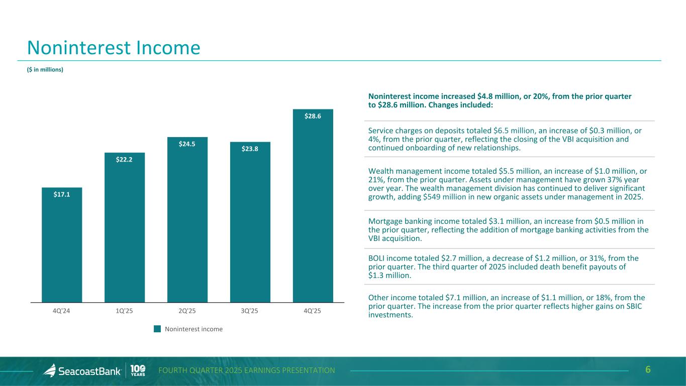 5FOURTH QUARTER 2025 EARNINGS PRESENTATION Net Interest Income and Net Interest Margin ($ in m ill io ns ) $116.1 $118.9 $127.3 $133.9 $176.2 3.39% 3.48% 3.58% 3.57% 3.66% 3.05% 3.24% 3.29% 3.32% 3.44% Net Interest Income Net Interest Margin NIM, excluding accretion on acquired loans 4Q'24 1Q'25 2Q'25 3Q'25 4Q'25 • Net interest income1 totaled $176.2 million, an increase of $42.3 million, or 32%, from the prior quarter. • Net interest margin increased nine basis points to 3.66% and, excluding the effect of accretion on acquired loans, net interest margin expanded 12 basis points to 3.44%. • Securities yields increased 21 basis points to 4.13%. • Loan yields increased six basis points from the prior quarter to 6.02%. Excluding the effect of accretion on acquired loans, yields increased seven basis points to 5.68%. • The cost of deposits declined 14 basis points to 1.67% and cost of funds decreased 16 basis points to 1.80%. 1Calculated on a fully taxable equivalent basis using amortized cost. 1
