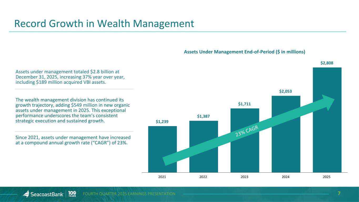 6FOURTH QUARTER 2025 EARNINGS PRESENTATION Noninterest income increased $4.8 million, or 20%, from the prior quarter to $28.6 million. Changes included: Service charges on deposits totaled $6.5 million, an increase of $0.3 million, or 4%, from the prior quarter, reflecting the closing of the VBI acquisition and continued onboarding of new relationships. Wealth management income totaled $5.5 million, an increase of $1.0 million, or 21%, from the prior quarter. Assets under management have grown 37% year over year. The wealth management division has continued to deliver significant growth, adding $549 million in new organic assets under management in 2025. Mortgage banking income totaled $3.1 million, an increase from $0.5 million in the prior quarter, reflecting the addition of mortgage banking activities from the VBI acquisition. BOLI income totaled $2.7 million, a decrease of $1.2 million, or 31%, from the prior quarter. The third quarter of 2025 included death benefit payouts of $1.3 million. Other income totaled $7.1 million, an increase of $1.1 million, or 18%, from the prior quarter. The increase from the prior quarter reflects higher gains on SBIC investments. Noninterest Income $17.1 $22.2 $24.5 $23.8 $28.6 Noninterest income 4Q'24 1Q'25 2Q'25 3Q'25 4Q'25 ($ in millions)
