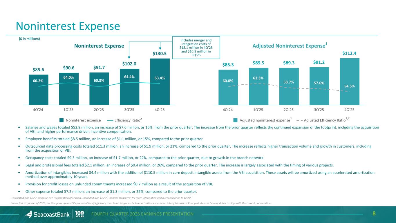 7FOURTH QUARTER 2025 EARNINGS PRESENTATION Assets Under Management End-of-Period ($ in millions) $1,239 $1,387 $1,711 $2,053 $2,808 2021 2022 2023 2024 2025 Record Growth in Wealth Management Assets under management totaled $2.8 billion at December 31, 2025, increasing 37% year over year, including $189 million acquired VBI assets. The wealth management division has continued its growth trajectory, adding $549 million in new organic assets under management in 2025. This exceptional performance underscores the team’s consistent strategic execution and sustained growth. Since 2021, assets under management have increased at a compound annual growth rate (“CAGR”) of 23%. 23% CAG R