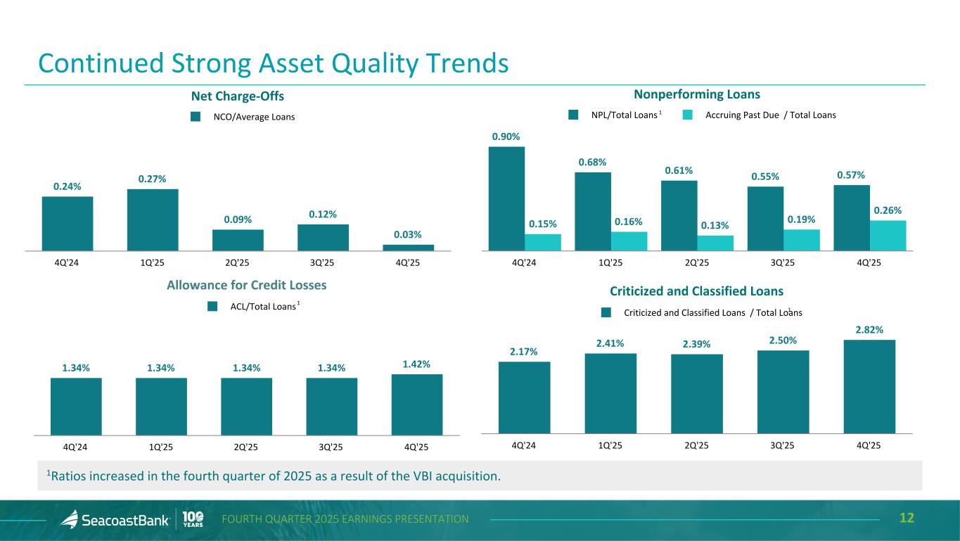 11FOURTH QUARTER 2025 EARNINGS PRESENTATION Allowance for Credit Losses and Purchase Discount ($ in millions) Loans Outstanding Allowance for Credit Losses % of Loans Outstanding Purchase Discount % of Loans Outstanding Construction and Land Development $ 724 $ 10 1.38 % $ 4 0.55 % Owner Occupied Commercial Real Estate 2,044 17 0.83 20 0.98 Commercial Real Estate 4,255 56 1.32 61 1.43 Residential Real Estate 3,099 51 1.65 44 1.42 Commercial & Financial 2,321 38 1.64 20 0.86 Consumer 185 7 3.76 1 0.54 Total $ 12,628 $ 179 1.42 % $ 150 1.19 % • The total allowance for credit losses of $179 million as of December 31, 2025 represents management’s estimate of lifetime expected credit losses and increased 21% from September 30, 2025 primarily due to the VBI acquisition. • The $150 million remaining unrecognized discount on acquired loans includes $59 million added on October 1, 2025 in connection with the VBI acquisition. • Additionally, a $7 million reserve for potential credit losses on lending-related commitments is reflected within Other liabilities, and includes $0.7 million associated with the VBI acquisition.