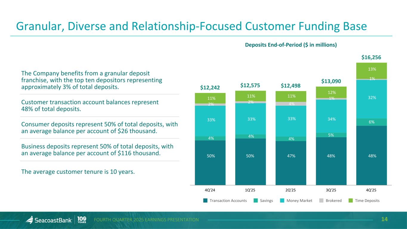 13FOURTH QUARTER 2025 EARNINGS PRESENTATION Well-Managed Deposit Costs Deposits increased $3.2 billion during the fourth quarter, including the addition of $3.5 billion from the VBI acquisition, partially offset by a decline of $68.7 million in brokered deposits. Outflows were largely the result of a targeted strategy to lower rates on certain categories of accounts. Continued focus on organic growth and relationship-based funding. The addition of commercial talent onboarding new relationships, in combination with our innovative analytics platform, supports a well- diversified, low-cost deposit portfolio. 12-Month Trend for Cost of Deposits 1.93% 1.93% 1.92% 1.85% 1.78% 1.78% 1.83% 1.84% 1.77% 1.72% 1.66% 1.64% Jan'25 Feb'25 Mar'25 Apr'25 May'25 Jun'25 Jul'25 Aug'25 Sep'25 Oct'25 Nov'25 Dec'25 $12,498 Deposits End-of-Period ($ in millions) $12,242 $12,575 $12,498 $13,090 $16,256 4.50% 4.50% 4.50% 4.25% 3.75% 2.08% 1.93% 1.80% 1.81% 1.67% Total Deposits Fed Funds Upper Limit Cost of Deposits 4Q'24 1Q'25 2Q'25 3Q'25 4Q'25