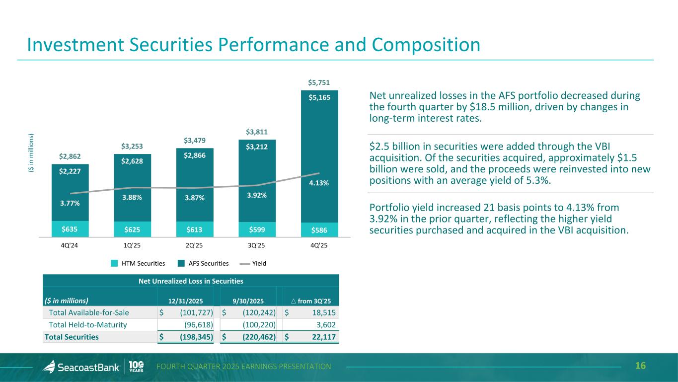 15FOURTH QUARTER 2025 EARNINGS PRESENTATION $16.12 $16.71 $17.19 $17.61 $15.14 4Q'24 1Q'25 2Q'25 3Q'25 4Q'25 9.6% 9.6% 9.8% 9.8% 9.3% 4Q'24 1Q'25 2Q'25 3Q'25 4Q'25 16.2% 16.1% 16.1% 15.9% 15.8%14.8% 14.7% 14.6% 14.5% 14.4% Total Risk Based Capital Tier 1 Ratio 4Q'24 1Q'25 2Q'25 3Q'25 4Q'25 10.9% 10.2% 12.8% 10.7% 9.1% 12.7% 10.3% 13.3% 13.0% 12.0% GAAP - ROTE Adjusted - ROTE 4Q'24 1Q'25 2Q'25 3Q'25 4Q'25 1Calculated treating all preferred shares as common. Each 1/1000th preferred share is convertible to one common share on the date a holder of preferred stock transfers such share of preferred stock to a non-affiliate of the holder. 2Non-GAAP measure, see “Explanation of Certain Unaudited Non-GAAP Financial Measures" for more information and a reconciliation to GAAP. 3FDICIA defines well capitalized as 10.0% for total risk-based capital and 8.0% for Tier 1 ratio at a total Bank level. 4Current quarter ratios are estimated. Tangible Book Value Per Share Tangible Equity / Tangible Assets Total Risk-Based and Tier 1 Capital3Return on Tangible Equity 2 10.0%4 8.0%4 Robust Capital Position Supporting a Fortress Balance Sheet $16.721