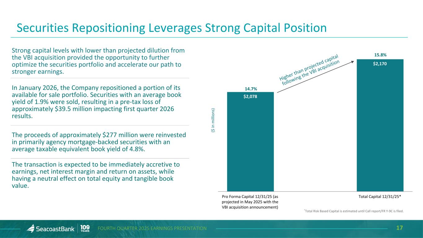 16FOURTH QUARTER 2025 EARNINGS PRESENTATION Investment Securities Performance and Composition Net unrealized losses in the AFS portfolio decreased during the fourth quarter by $18.5 million, driven by changes in long-term interest rates. $2.5 billion in securities were added through the VBI acquisition. Of the securities acquired, approximately $1.5 billion were sold, and the proceeds were reinvested into new positions with an average yield of 5.3%. Portfolio yield increased 21 basis points to 4.13% from 3.92% in the prior quarter, reflecting the higher yield securities purchased and acquired in the VBI acquisition. Net Unrealized Loss in Securities ($ in millions) 12/31/2025 9/30/2025 △ from 3Q'25 Total Available-for-Sale $ (101,727) $ (120,242) $ 18,515 Total Held-to-Maturity (96,618) (100,220) 3,602 Total Securities $ (198,345) $ (220,462) $ 22,117 ($ in m ill io ns ) $2,862 $3,253 $3,479 $3,811 $5,751 $635 $625 $613 $599 $586 $2,227 $2,628 $2,866 $3,212 $5,165 3.77% 3.88% 3.87% 3.92% 4.13% HTM Securities AFS Securities Yield 4Q'24 1Q'25 2Q'25 3Q'25 4Q'25