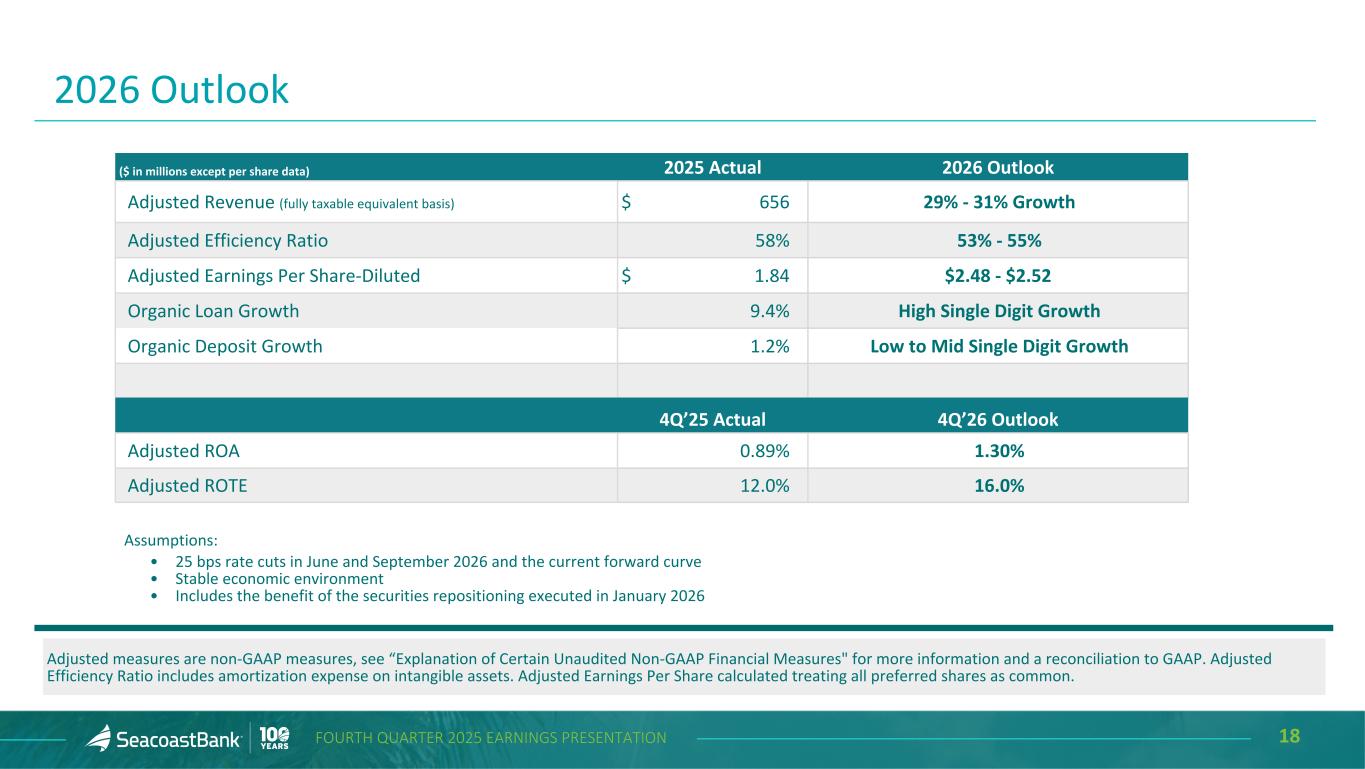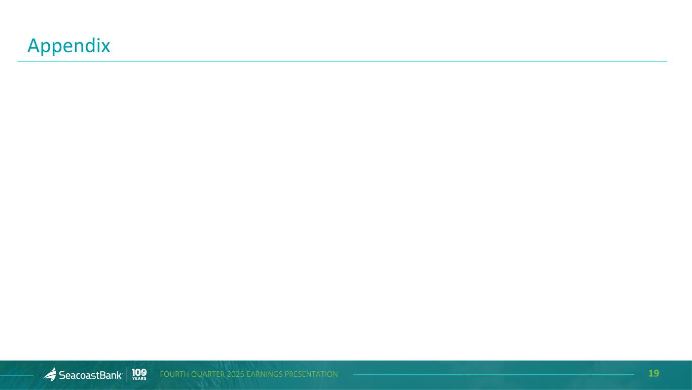 17FOURTH QUARTER 2025 EARNINGS PRESENTATION Securities Repositioning Leverages Strong Capital Position Strong capital levels with lower than projected dilution from the VBI acquisition provided the opportunity to further optimize the securities portfolio and accelerate our path to stronger earnings. In January 2026, the Company repositioned a portion of its available for sale portfolio. Securities with an average book yield of 1.9% were sold, resulting in a pre-tax loss of approximately $39.5 million impacting first quarter 2026 results. The proceeds of approximately $277 million were reinvested in primarily agency mortgage-backed securities with an average taxable equivalent book yield of 4.8%. The transaction is expected to be immediately accretive to earnings, net interest margin and return on assets, while having a neutral effect on total equity and tangible book value. ($ in m ill io ns ) $2,078 $2,170 Pro Forma Capital 12/31/25 (as projected in May 2025 with the VBI acquisition announcement) Total Capital 12/31/25* *Total Risk Based Capital is estimated until Call report/FR Y-9C is filed. High er th an p roje cted cap ital follo wing the VBI acq uisit ion 14.7% 15.8%