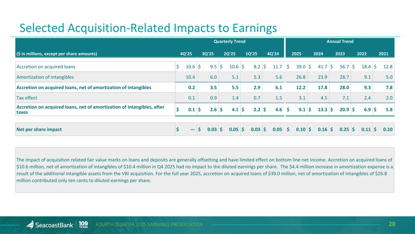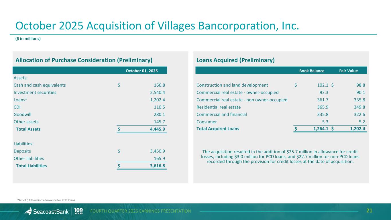 20FOURTH QUARTER 2025 EARNINGS PRESENTATION Selected Acquisition-Related Impacts to Earnings Quarterly Trend Annual Trend ($ in millions, except per share amounts) 4Q’25 3Q’25 2Q’25 1Q’25 4Q’24 2025 2024 2023 2022 2021 Accretion on acquired loans $ 10.6 $ 9.5 $ 10.6 $ 8.2 $ 11.7 $ 39.0 $ 41.7 $ 56.7 $ 18.4 $ 12.8 Amortization of intangibles 10.4 6.0 5.1 5.3 5.6 26.8 23.9 28.7 9.1 5.0 Accretion on acquired loans, net of amortization of intangibles 0.2 3.5 5.5 2.9 6.1 12.2 17.8 28.0 9.3 7.8 Tax effect 0.1 0.9 1.4 0.7 1.5 3.1 4.5 7.1 2.4 2.0 Accretion on acquired loans, net of amortization of intangibles, after taxes $ 0.1 $ 2.6 $ 4.1 $ 2.2 $ 4.6 $ 9.1 $ 13.3 $ 20.9 $ 6.9 $ 5.8 Net per share impact $ — $ 0.03 $ 0.05 $ 0.03 $ 0.05 $ 0.10 $ 0.16 $ 0.25 $ 0.11 $ 0.10 The impact of acquisition related fair value marks on loans and deposits are generally offsetting and have limited effect on bottom line net income. Accretion on acquired loans of $10.6 million, net of amortization of intangibles of $10.4 million in Q4 2025 had no impact to the diluted earnings per share. The $4.4 million increase in amortization expense is a result of the additional intangible assets from the VBI acquisition. For the full year 2025, accretion on acquired loans of $39.0 million, net of amortization of intangibles of $26.8 million contributed only ten cents to diluted earnings per share.