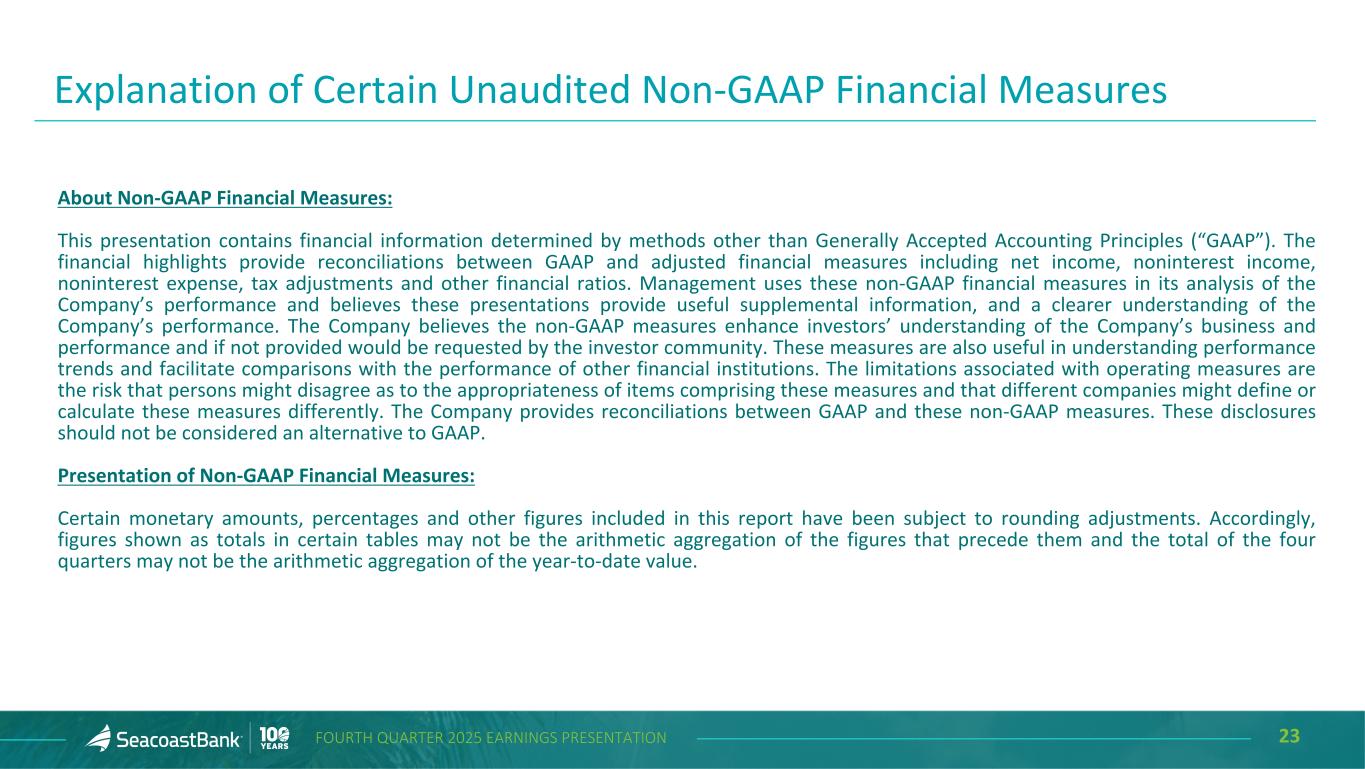 23FOURTH QUARTER 2025 EARNINGS PRESENTATION About Non-GAAP Financial Measures: This presentation contains financial information determined by methods other than Generally Accepted Accounting Principles (“GAAP”). The financial highlights provide reconciliations between GAAP and adjusted financial measures including net income, noninterest income, noninterest expense, tax adjustments and other financial ratios. Management uses these non-GAAP financial measures in its analysis of the Company’s performance and believes these presentations provide useful supplemental information, and a clearer understanding of the Company’s performance. The Company believes the non-GAAP measures enhance investors’ understanding of the Company’s business and performance and if not provided would be requested by the investor community. These measures are also useful in understanding performance trends and facilitate comparisons with the performance of other financial institutions. The limitations associated with operating measures are the risk that persons might disagree as to the appropriateness of items comprising these measures and that different companies might define or calculate these measures differently. The Company provides reconciliations between GAAP and these non-GAAP measures. These disclosures should not be considered an alternative to GAAP. Presentation of Non-GAAP Financial Measures: Certain monetary amounts, percentages and other figures included in this report have been subject to rounding adjustments. Accordingly, figures shown as totals in certain tables may not be the arithmetic aggregation of the figures that precede them and the total of the four quarters may not be the arithmetic aggregation of the year-to-date value. Explanation of Certain Unaudited Non-GAAP Financial Measures