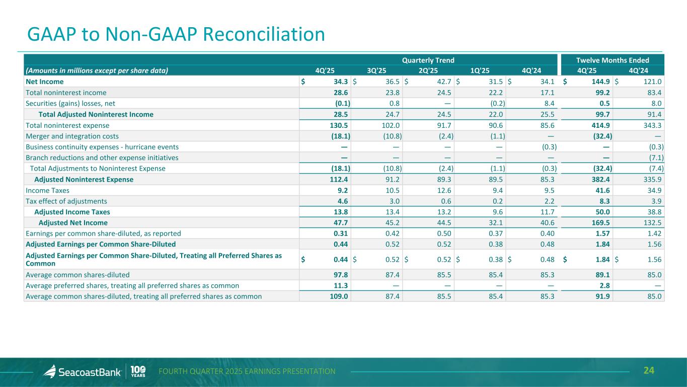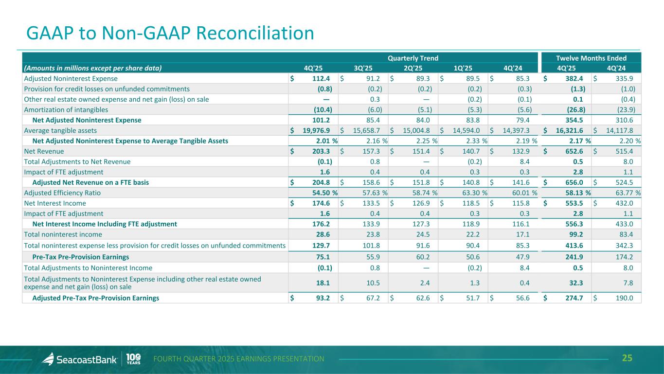 24FOURTH QUARTER 2025 EARNINGS PRESENTATION Quarterly Trend Twelve Months Ended (Amounts in millions except per share data) 4Q'25 3Q'25 2Q'25 1Q'25 4Q'24 4Q'25 4Q'24 Net Income $ 34.3 $ 36.5 $ 42.7 $ 31.5 $ 34.1 $ 144.9 $ 121.0 Total noninterest income 28.6 23.8 24.5 22.2 17.1 99.2 83.4 Securities (gains) losses, net (0.1) 0.8 — (0.2) 8.4 0.5 8.0 Total Adjusted Noninterest Income 28.5 24.7 24.5 22.0 25.5 99.7 91.4 Total noninterest expense 130.5 102.0 91.7 90.6 85.6 414.9 343.3 Merger and integration costs (18.1) (10.8) (2.4) (1.1) — (32.4) — Business continuity expenses - hurricane events — — — — (0.3) — (0.3) Branch reductions and other expense initiatives — — — — — — (7.1) Total Adjustments to Noninterest Expense (18.1) (10.8) (2.4) (1.1) (0.3) (32.4) (7.4) Adjusted Noninterest Expense 112.4 91.2 89.3 89.5 85.3 382.4 335.9 Income Taxes 9.2 10.5 12.6 9.4 9.5 41.6 34.9 Tax effect of adjustments 4.6 3.0 0.6 0.2 2.2 8.3 3.9 Adjusted Income Taxes 13.8 13.4 13.2 9.6 11.7 50.0 38.8 Adjusted Net Income 47.7 45.2 44.5 32.1 40.6 169.5 132.5 Earnings per common share-diluted, as reported 0.31 0.42 0.50 0.37 0.40 1.57 1.42 Adjusted Earnings per Common Share-Diluted 0.44 0.52 0.52 0.38 0.48 1.84 1.56 Adjusted Earnings per Common Share-Diluted, Treating all Preferred Shares as Common $ 0.44 $ 0.52 $ 0.52 $ 0.38 $ 0.48 $ 1.84 $ 1.56 Average common shares-diluted 97.8 87.4 85.5 85.4 85.3 89.1 85.0 Average preferred shares, treating all preferred shares as common 11.3 — — — — 2.8 — Average common shares-diluted, treating all preferred shares as common 109.0 87.4 85.5 85.4 85.3 91.9 85.0 GAAP to Non-GAAP Reconciliation
